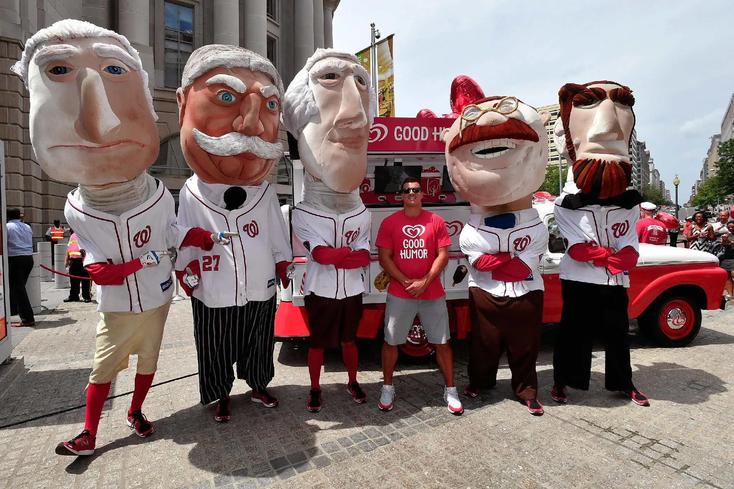 Washington Redskins Linebacker Ryan Kerrigan and the Washington Nationals Racing Presidents help launch the Washingtn D.C. leg of the Good Humor Welcome to Joyhood Tour at the Ronald Reagan Building on July 26, 2016 in Washington, DC. (Photo by Larry French/Getty Images for Good Humor)