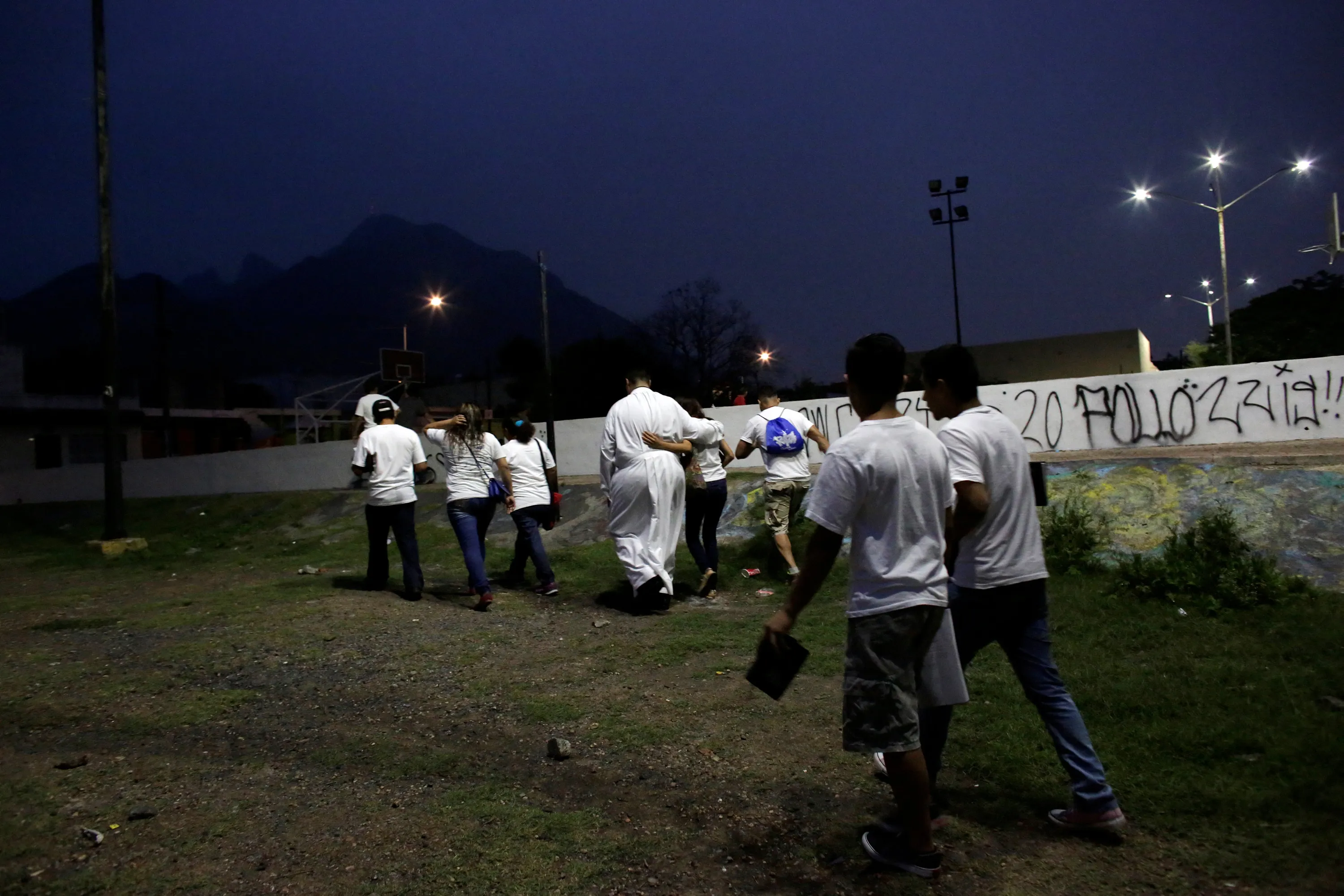 An aspiring Catholic priest Jose Luis Guerra (C), a member of Raza Nueva in Christ, a project of the archdiocese of Monterrey, walks along missionaries during a visit to a neighbourhood in the municipality of Guadalupe, on the outskirts of Monterrey, Mexico, May 30, 2016. (Photo by Daniel Becerril/Reuters)