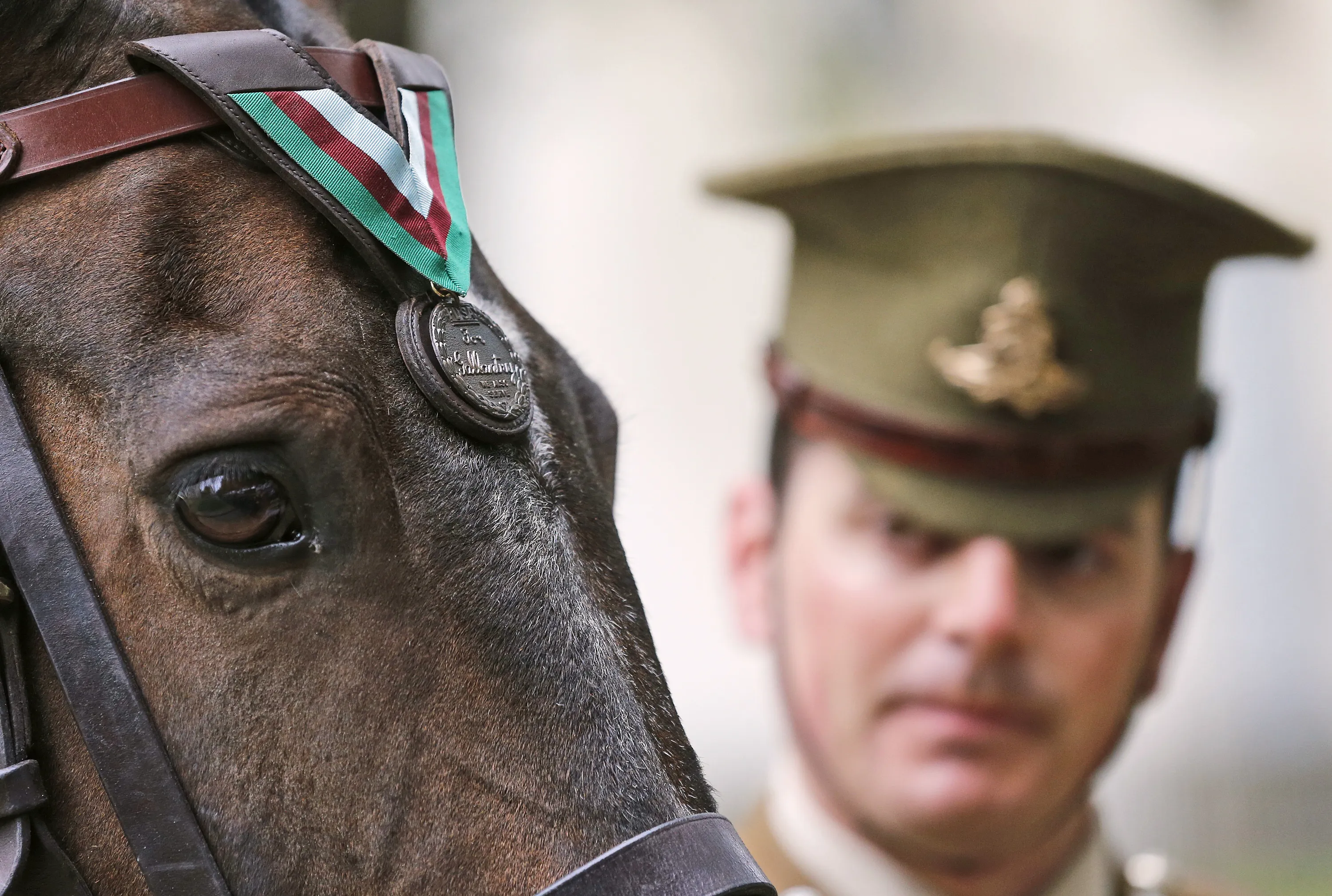 Horse Haldalgo, representing life-saving US Marine horse Sergeant Reckless who served with the US Marine Corps during the Korean War, is awarded with the PDSA Dickin Medal watched by Sergeant Mark Gostling in London, Wednesday, July 27, 2016. Reckless, who survived one of the bloodiest battles in modern military history, has today been awarded the PDSA Dickin Medal – known as the animal equivalent of the Victoria Cross – for her bravery and devotion to duty during the Korean war 1950 until 1953. (Photo by Frank Augstein/AP Photo)
