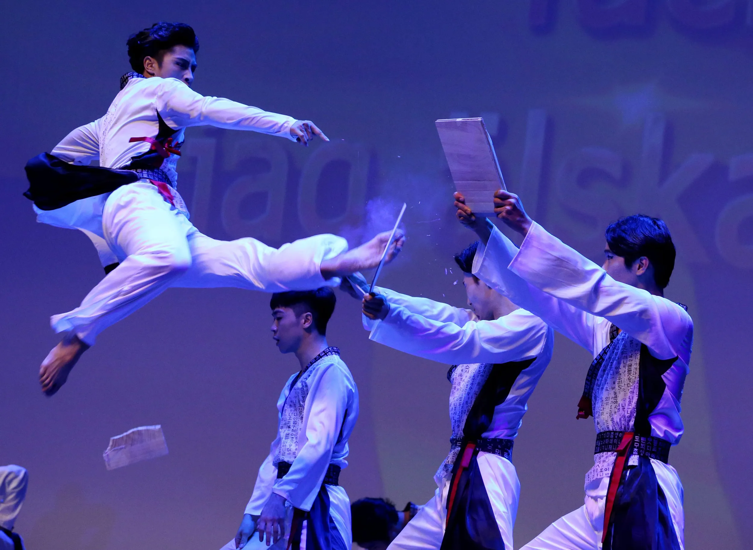 Members of the South Korean taekwondo team perform during the commemoration ceremony for the 63th anniversary of the Korea War Armistice Agreement and UN Forces Participation Day in Seoul, South Korea, 27 July 2016. The event was organized to mark the 63th anniversary of the signing of the armistice that ended the Korean War, which falls on 27 July. (Photo by Jeon Heon-Kyun/EPA)