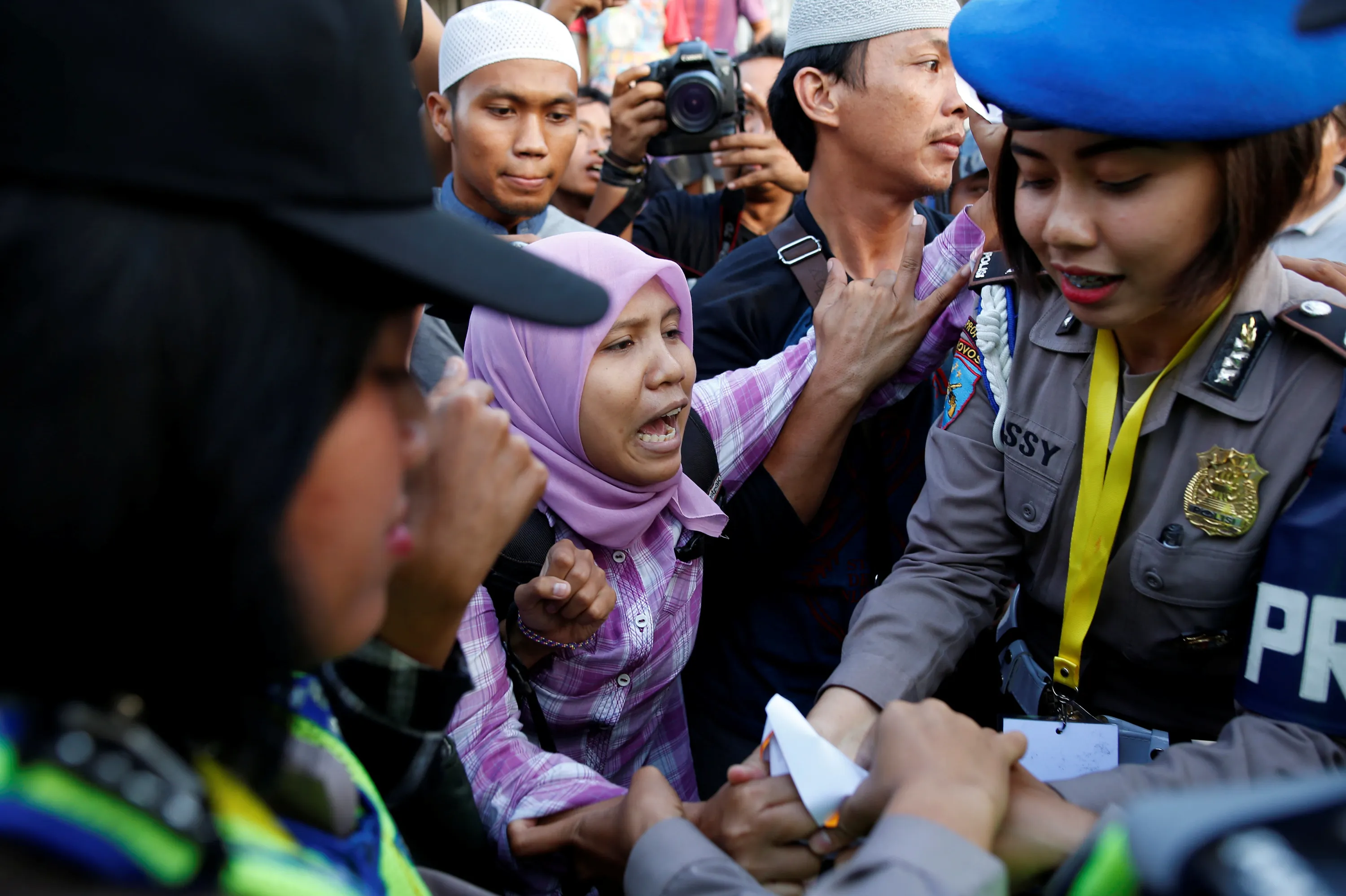 Police remove a protester who was part of a small group rallying in support of a female death-row prisoner near the gate to the ferry port for the prison island of Nusa Kambangan island, ahead of the expected execution of 14 drug convicts including at least four foreigners in Cilacap, Central Java, Indonesia July 28, 2016. (Photo by Darren Whiteside/Reuters)