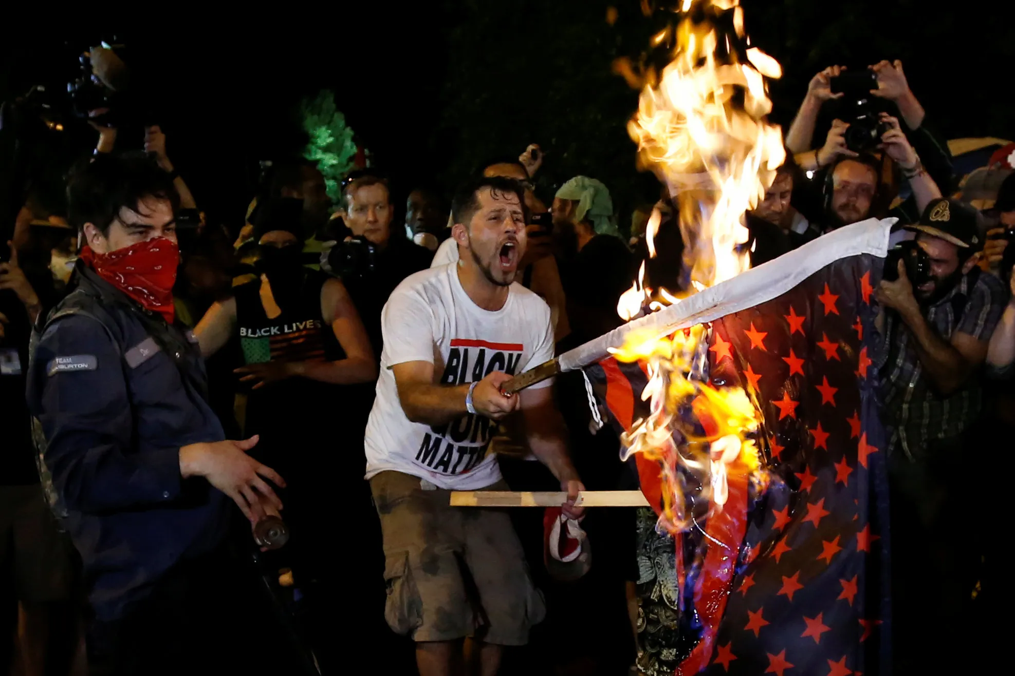 Protesters from various organizations surround men who were burning a modified American flag along the perimeter walls of the 2016 Democratic National Convention in Philadelphia, Pennsylvania on July 27, 2016. (Photo by Adrees Latif/Reuters)