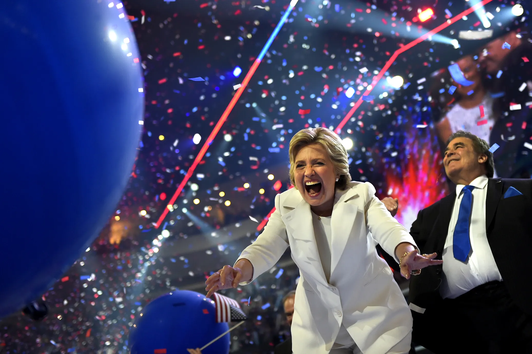 Hillary Clinton celebrates on stage after accepting the Presidential nomination at the Democratic National Convention in Philadelphia on July 28, 2016. (Photo by Michael Robinson Chavez/The Washington Post)