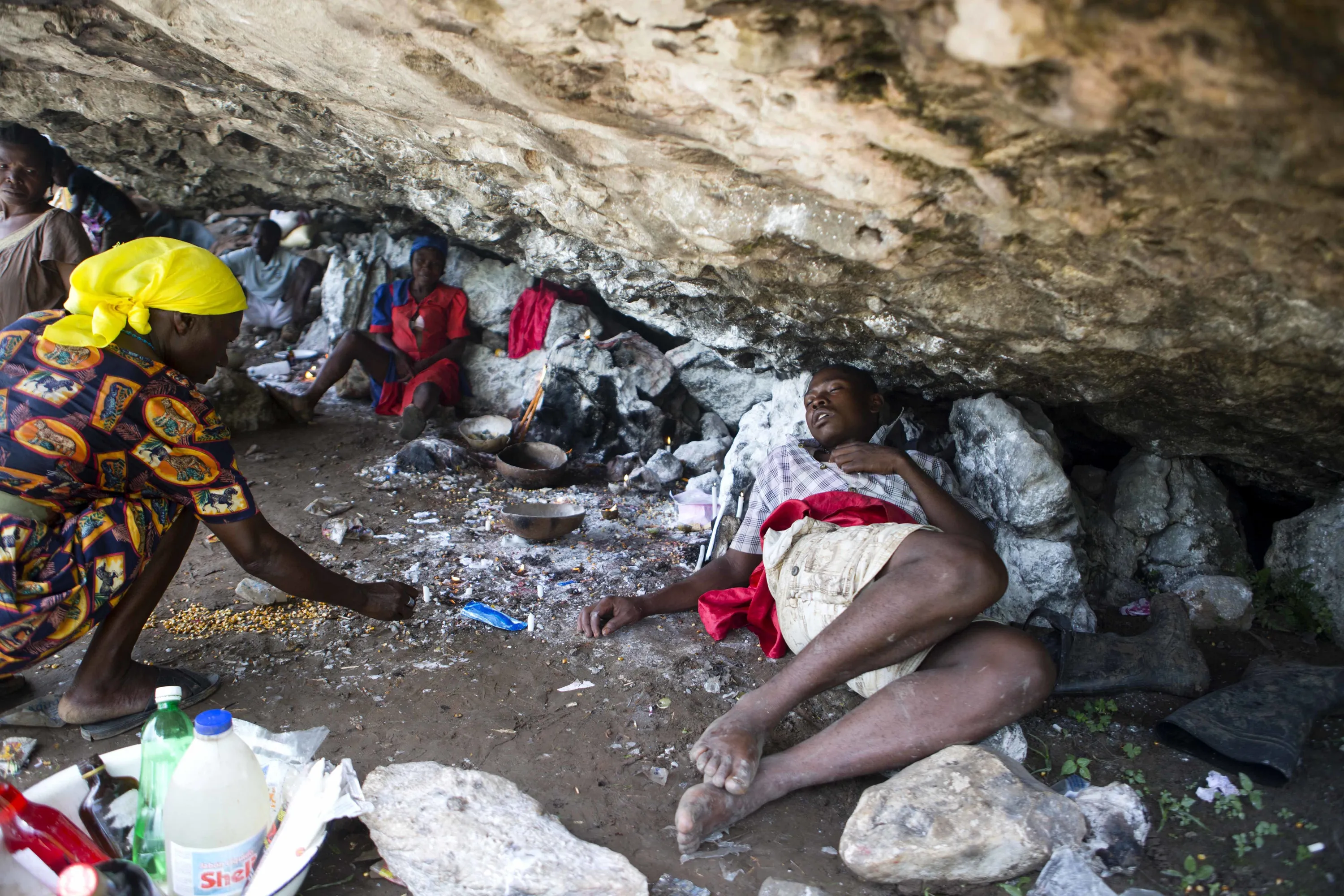 In this July 23, 2016 photo, a Voodoo pilgrim places a candle in a crevice next to a sleeping man in Plaine-du-Nord, Haiti. People pray and make offerings at Plaine-du-Nord's Catholic church of St. James, who is known as Ogoun Feraille and revered by followers of Voodoo. (Photo by Dieu Nalio Chery/AP Photo)