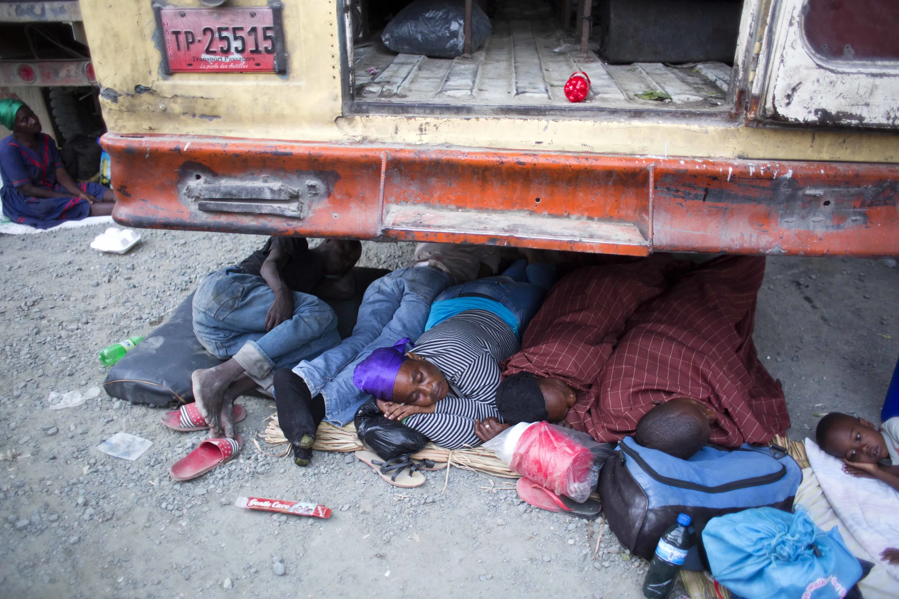 In this July 24, 2016 photo, pilgrims sleep under a school bus during the annual Voodoo celebration in Plaine-du-Nord, Haiti. While some sleep in a public school, others sleep on the side of the road and the front yards of local homes due to a lack of accommodations. (Photo by Dieu Nalio Chery/AP Photo)