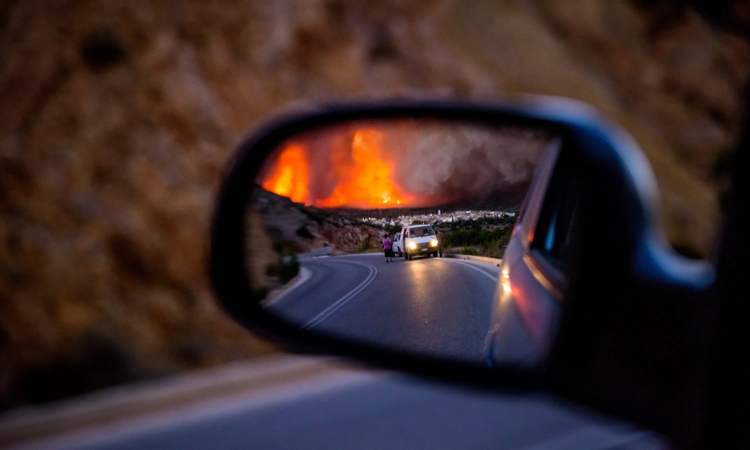A picture made available on 26 July 2016 shows citizens wathcing the dense smoke over Lithi village, as reflected in a mirror of a car, during a wildfire on Chios island, Greece, 25 July 2016. The huge wildfire that broke out early 25 July 2016, on the island of Chios which has burned 3,500 hectares of forest and farm land, set under control. Over 90 percent of the mastic trees at the villages of Lithi, Elata and Vessa were destroyed while a large number of mastic trees were burned at the villages of Mesta, Armolia and Pyrgi. (Photo by Kostas Koyrgias/EPA)