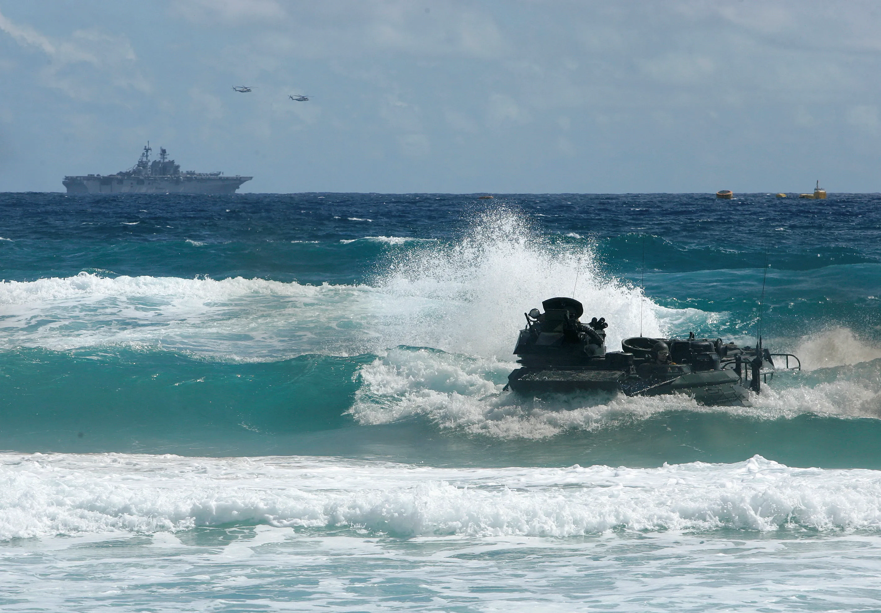 An amphibious assault vehicle drives through the waves during a simulated beach assault at Marine Corps Base Hawaii with the 3rd Marine Expeditionary Unit during the multi-national military exercise RIMPAC in Kaneohe, Hawaii, July 30, 2016. (Photo by Hugh Gentry/Reuters)