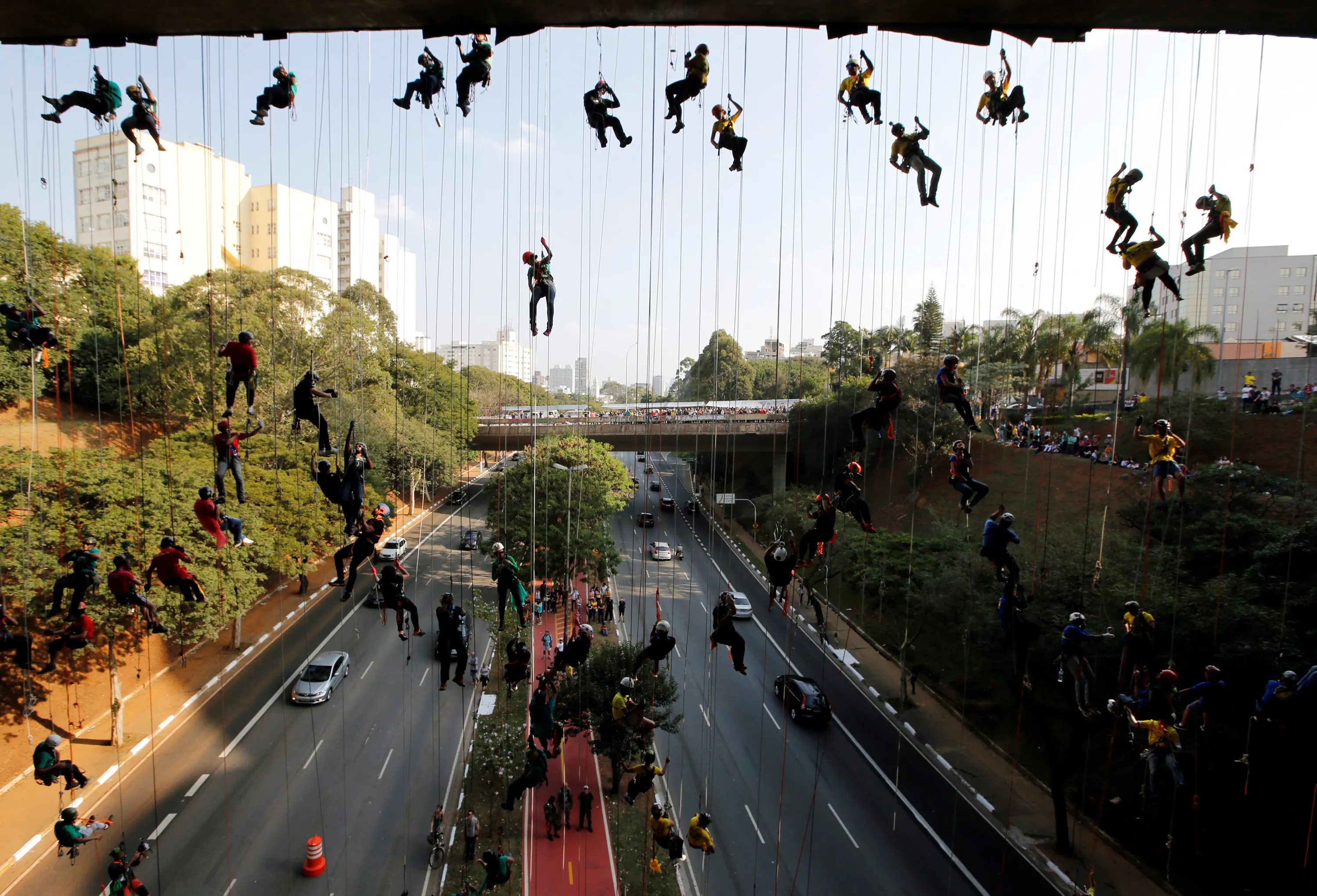 People rappel from a bridge to form the Olympic rings in Sao Paulo, Brazil, July 31, 2016. (Photo by Paulo Whitaker/Reuters)