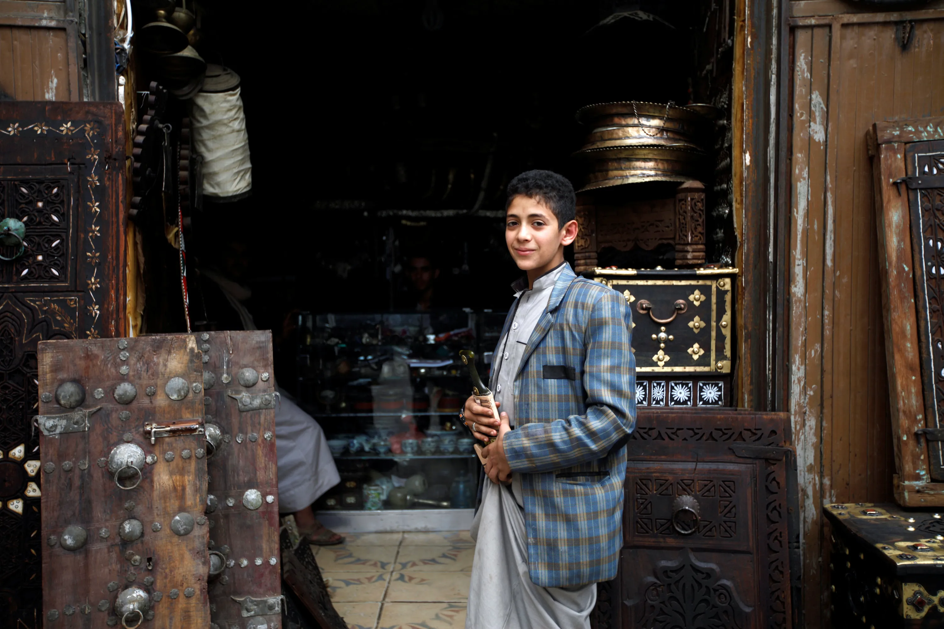 A young man smiles as he comes out of a traditional gift shop at the old quarter of the city of Sanaa, Yemen, July 24, 2016. (Photo by Mohamed al-Sayaghi/Reuters)