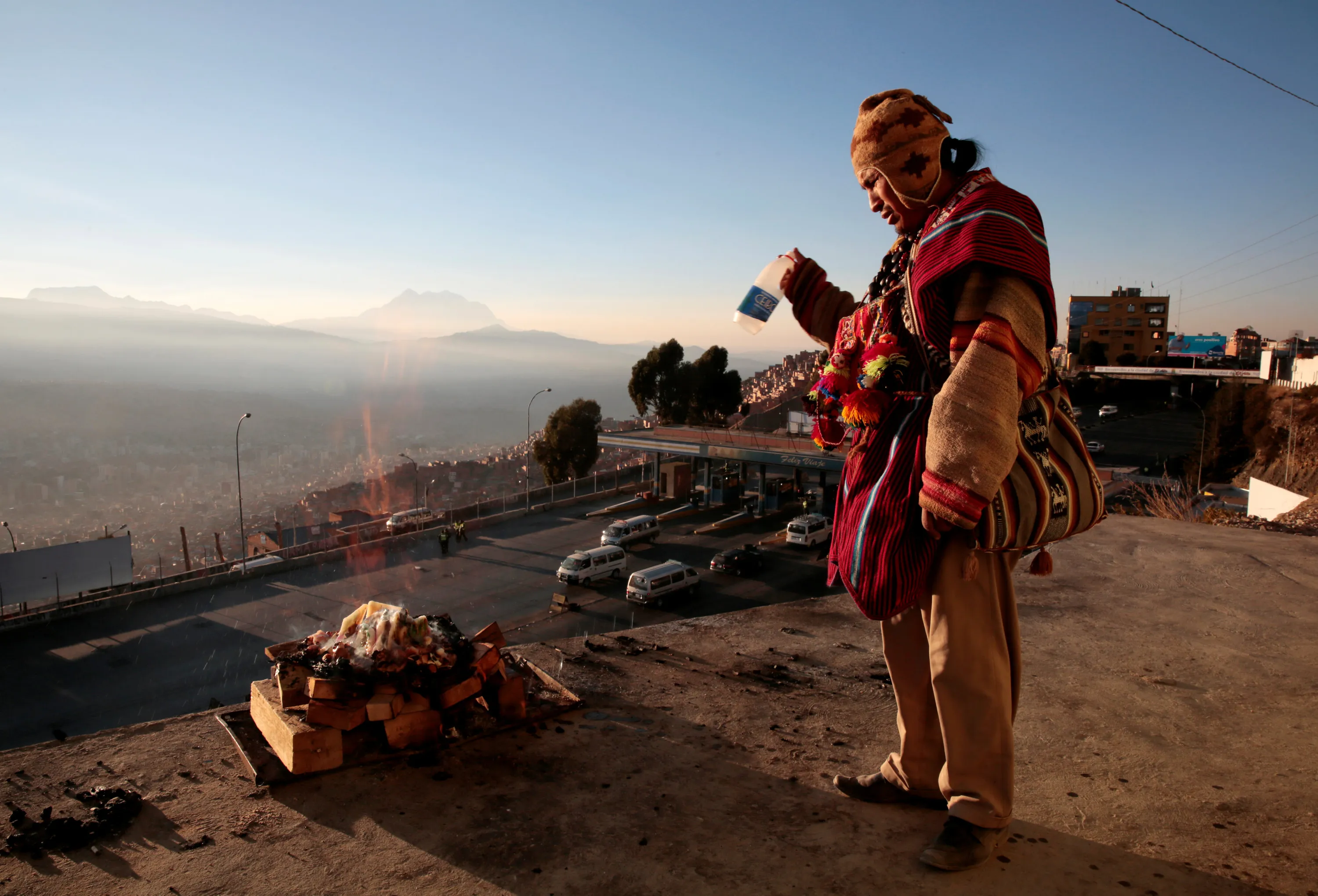 A Bolivian Aymara witch doctor sprays alcohol to burn an offerings for the “Pachamama” (Mother Earth) in El Alto, Bolivia, August 1, 2016. Pachamama is a goddess revered by the indigenous people of the Andes. She is also known as the earth/time mother. In Inca mythology, Pachamama is a fertility goddess who presides over planting and harvesting, embodies the mountains, and causes earthquakes. She is also an ever present and independent deity who has her own self-sufficient and creative power to sustain life on this earth. (Photo by David Mercado/Reuters)