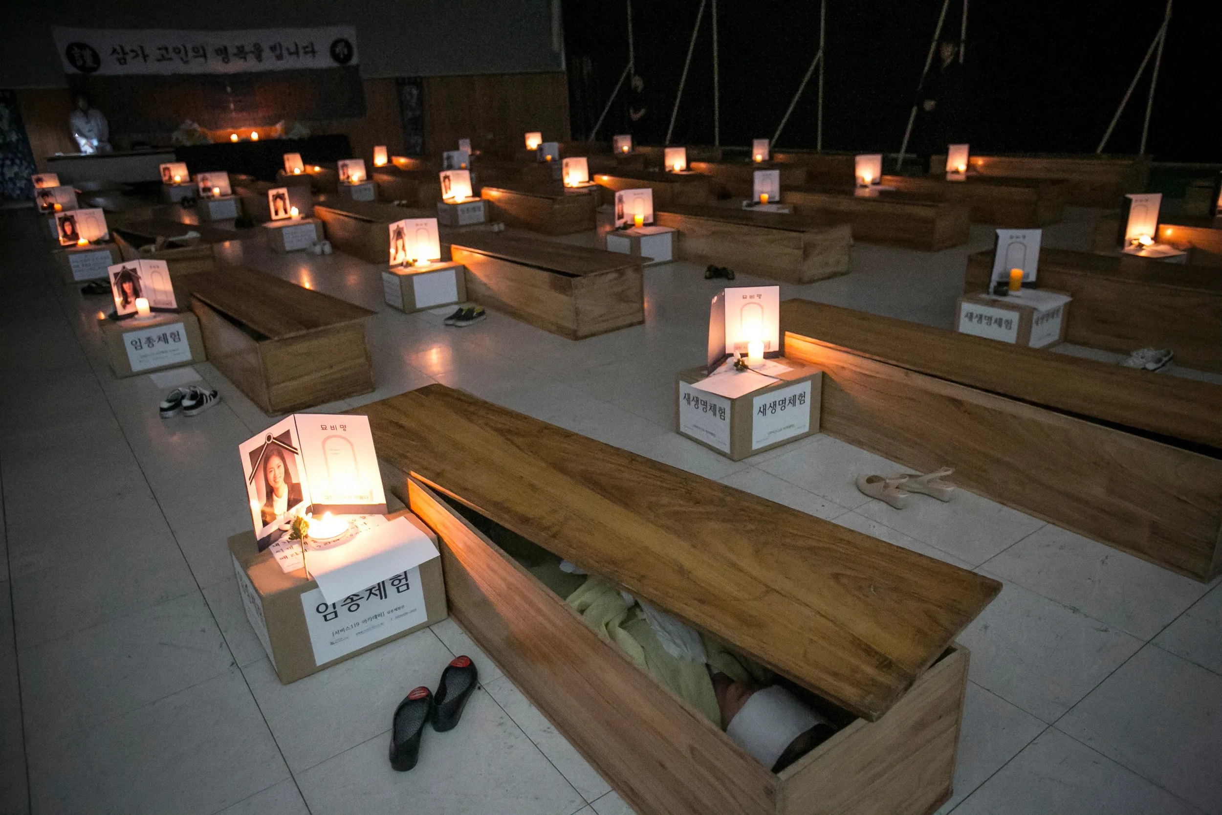 Participants reflect on their lives as they lie down inside coffins during a “Death Experience/Fake Funeral” session held by Happy Dying on August 1, 2016 in Andong, South Korea. Fifty adults who work at the Andong University in South Korea participated in the self-help seminar where participants reflect on their lives by experiencing the fake funeral of theirs. (Photo by Jean Chung/Getty Images)