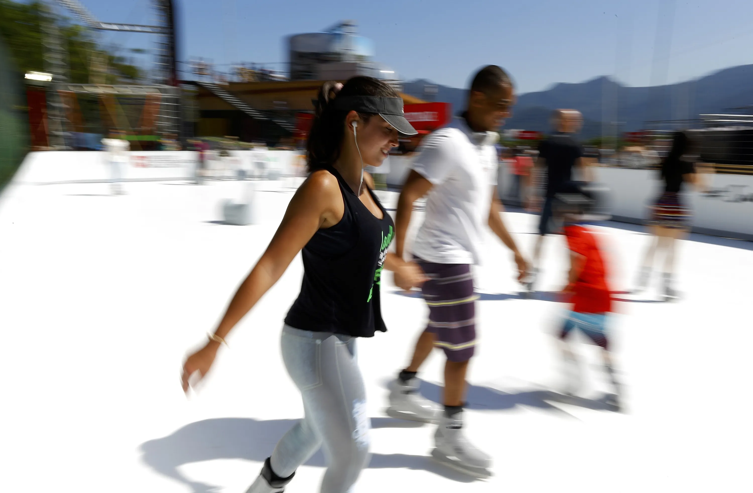People use adapted ice skates to skate on an artificial ice rink at the Switzerland house in Lagoa, Rio de Janeiro, Brazil on August 1, 2016. (Photo by Ivan Alvarado/Reuters)