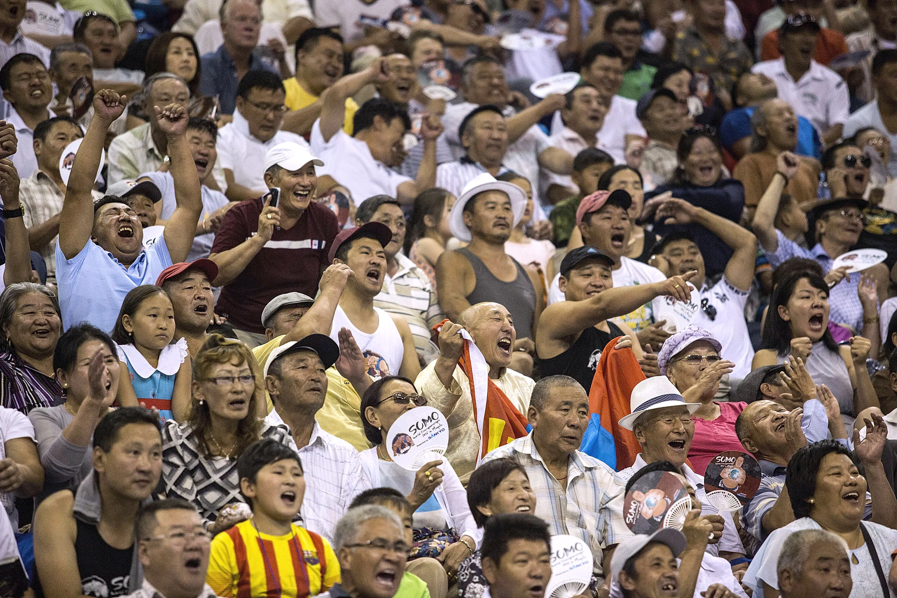 Fans react after a Mongolian wrestler defeats a Japanese opponent during the 2016 World Sumo Championship on July 30, 2016 in Ulaanbaatar, Mongolia. (Photo by Taylor Weidman/Getty Images)