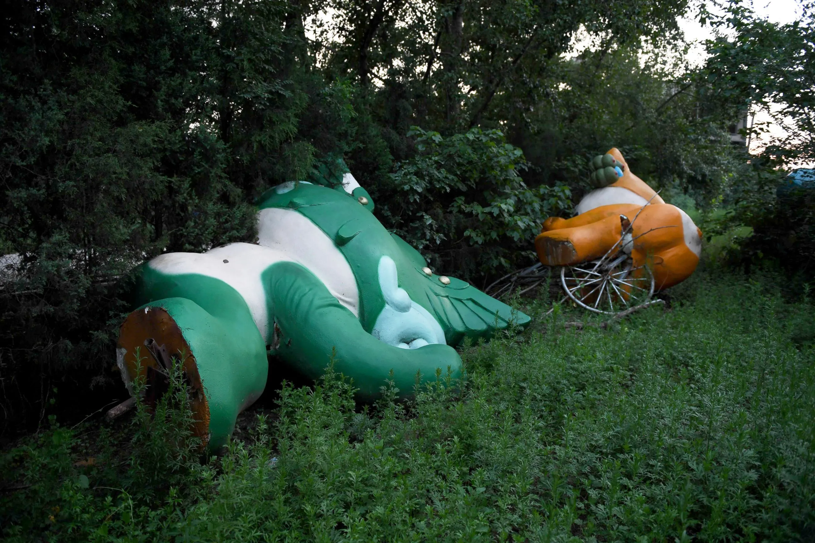 Nini, left, and Yingying, two of the five mascots for the 2008 Beijing Olympic Games, are seen lying among trees behind an abandoned, never-completed mall in Beijing. The fallen mascots are a reminder of the high costs of hosting the event. Their derelict state reflects the challenges that China has faced in finding new uses for its Olympic investments, with many venues falling into disrepair and some construction projects left incomplete. (Photo by Greg Baker/AFP Photo)