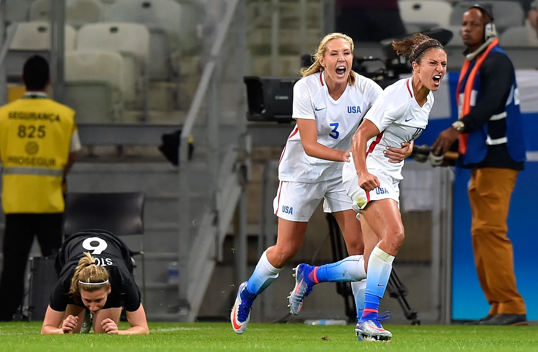 Carli Lloyd #10 of United States and Allie Long #3 of United States celebrate after Lloyd scores in the first half in the Women's Group G first round match between the United States and New Zealand during the Rio 2016 Olympic Games at Mineirao Stadium on August 3, 2016 in Belo Horizonte, Brazil. (Photo by Pedro Vilela/Getty Images)
