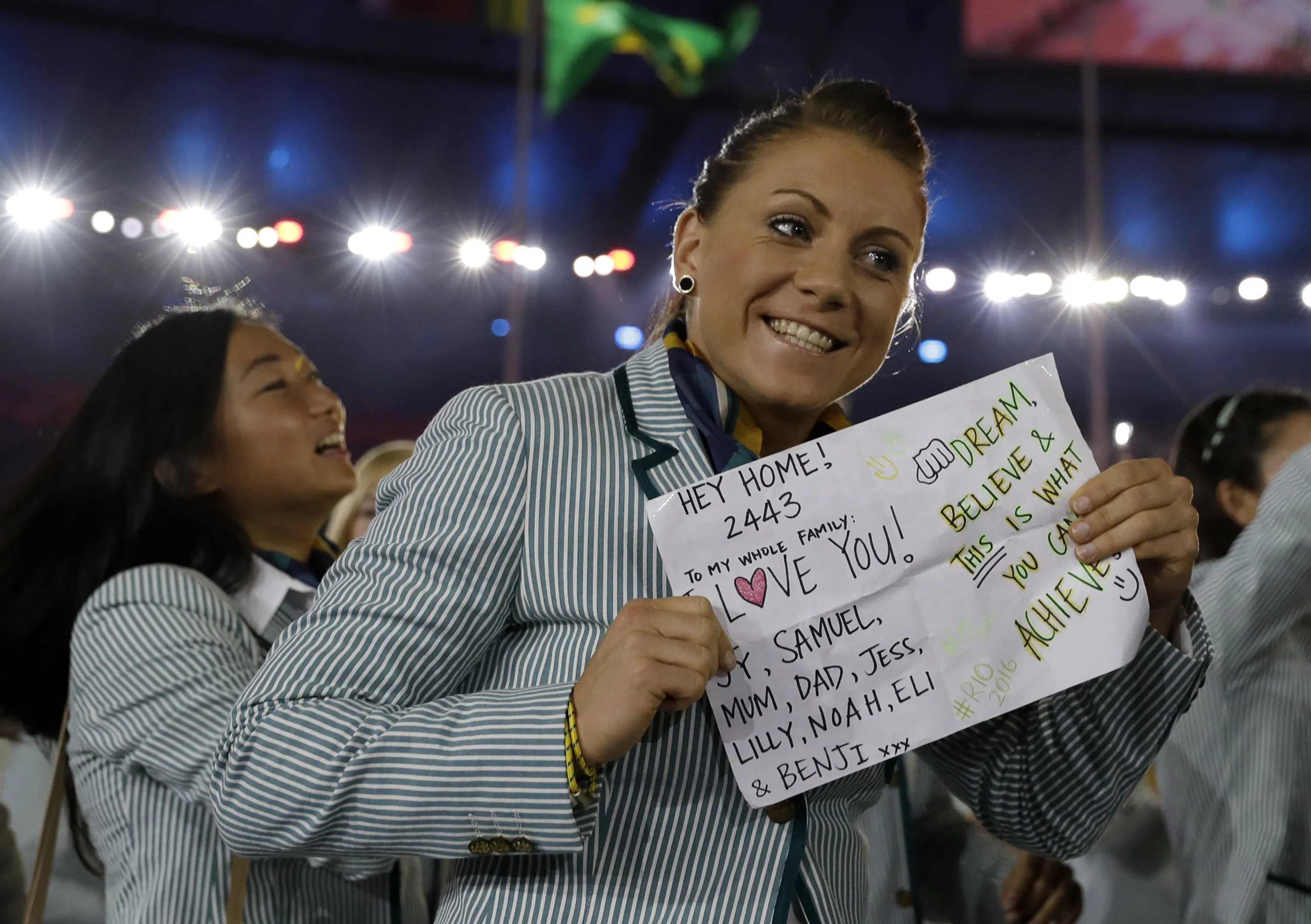 An Australian athlete holds up a sign as the Australia team arrive during the opening ceremony for the 2016 Summer Olympics in Rio de Janeiro, Brazil, Friday, August 5, 2016. (Photo by David J. Phillip/AP Photo)