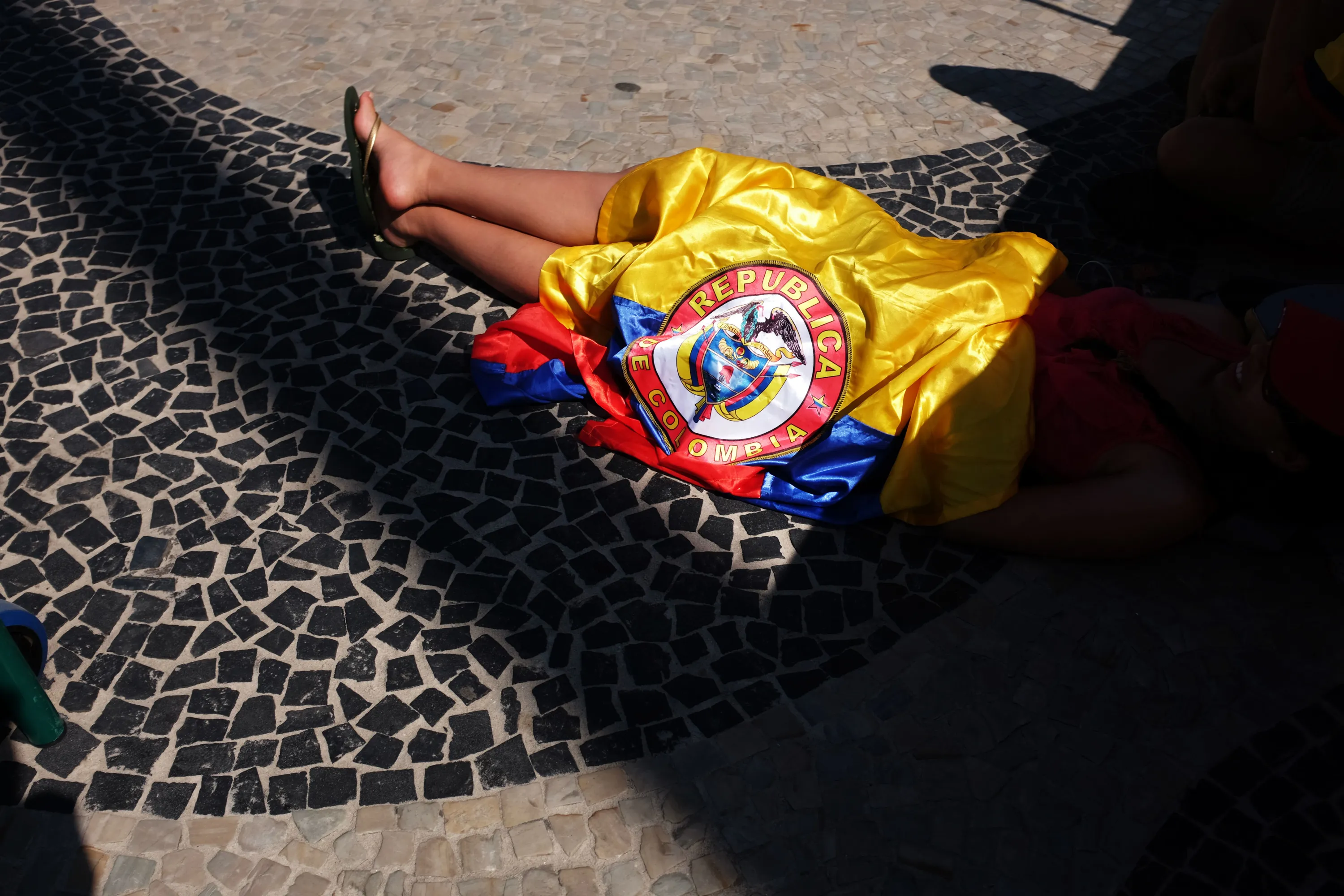 Patricia Lopez, of Columbia, sits with a flag in the shade while waiting for the men's cycling road race to come by along Copacabana beach in Rio de Janeiro, Brazil, Saturday, August 6, 2016. (Photo by David Goldman/AP Photo)