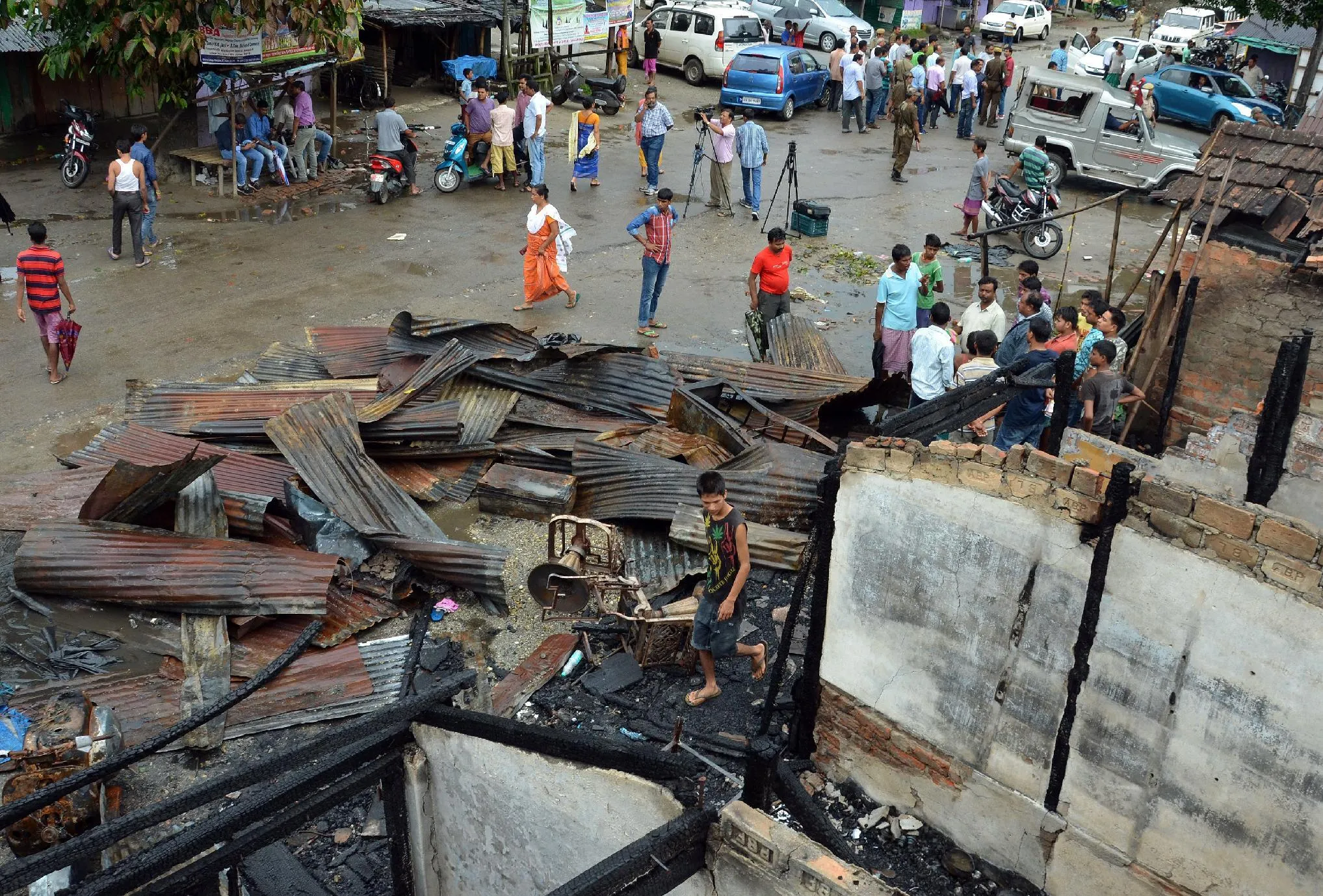 People stand next to the burnt shops after gunmen flung grenades in a market on Friday, on the outskirts of Kokrajhar town, in the northeastern state of Assam, India, August 6, 2016. (Photo by Reuters/Stringer)