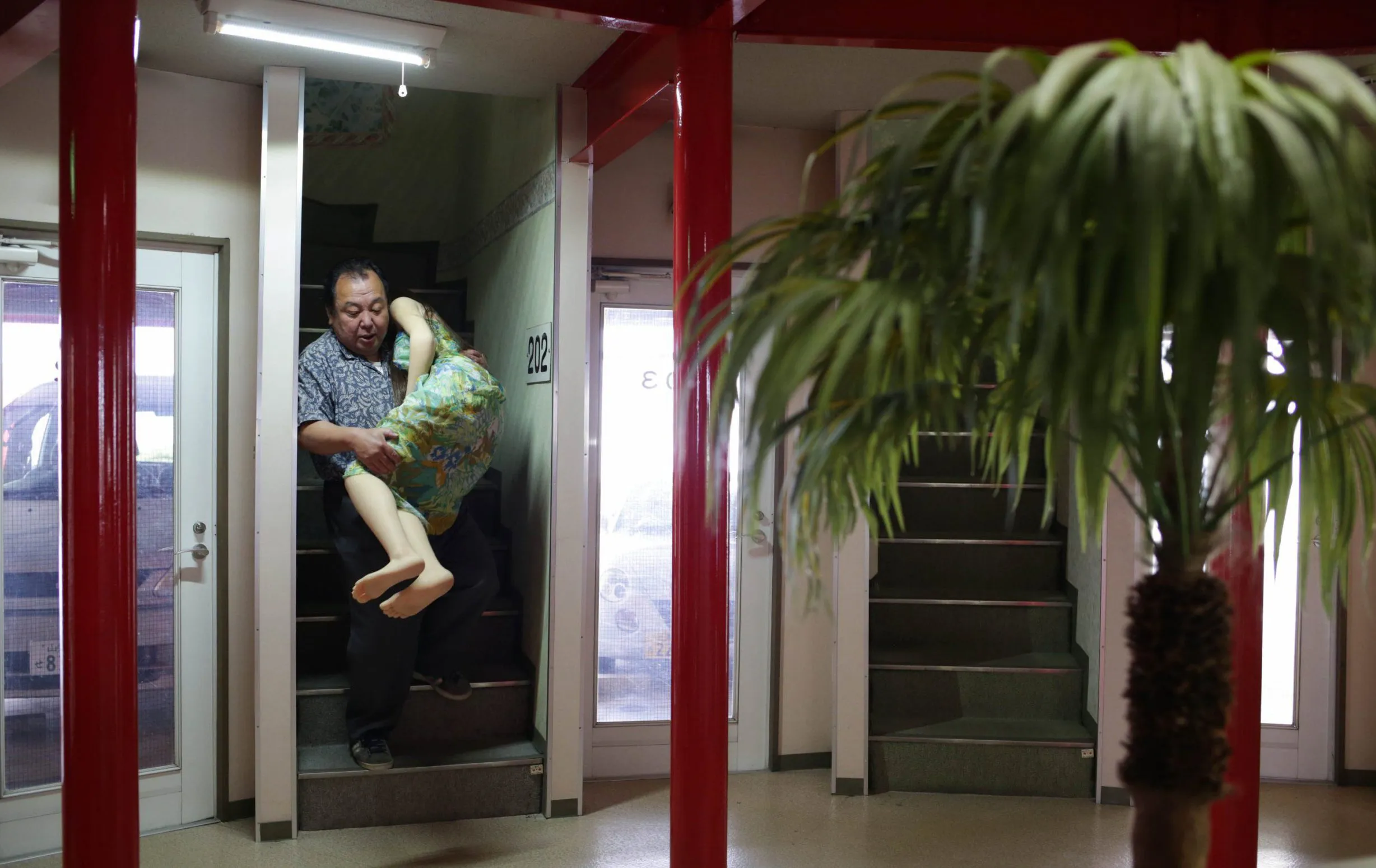 Senji Nakajima carries his love doll “Saori” out from Love Hotel on June 5, 2016 in Nagano, Japan. (Photo by Taro Karibe/Getty Images)
