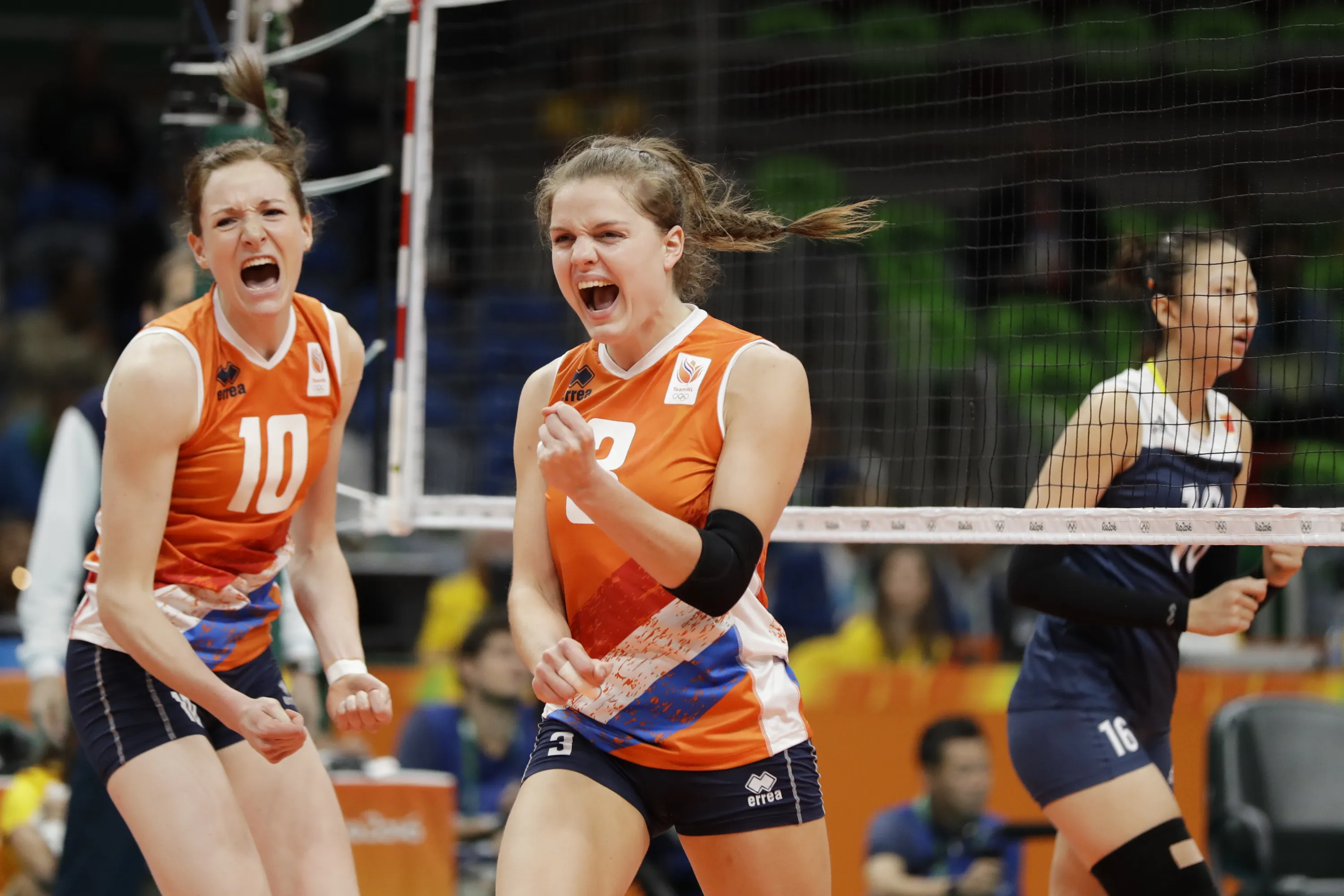 Netherlands' Lonneke Sloetjes (10) and Yvon Belien (3) react during a women's preliminary volleyball match against China at the 2016 Summer Olympics in Rio de Janeiro, Brazil, Saturday, August 6, 2016. (Photo by Matt Rourke/AP Photo)