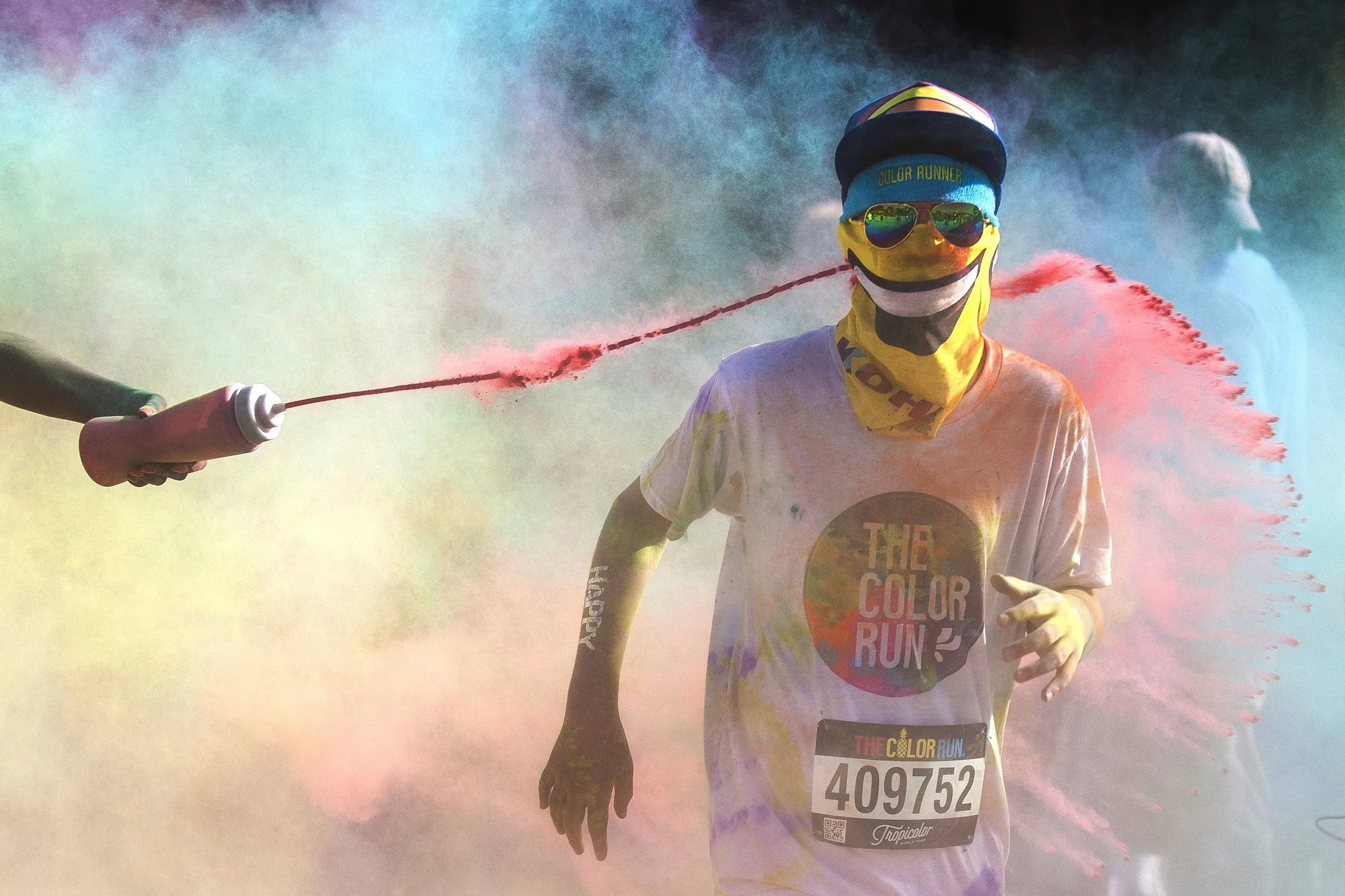A participant crosses the finish line of the Color Run's Tropicolor World Tour in downtown Grand Rapids, Mich., Saturday, August 5, 2016. (Photo by Allison Farrand/The Grand Rapids Press via AP Photo)