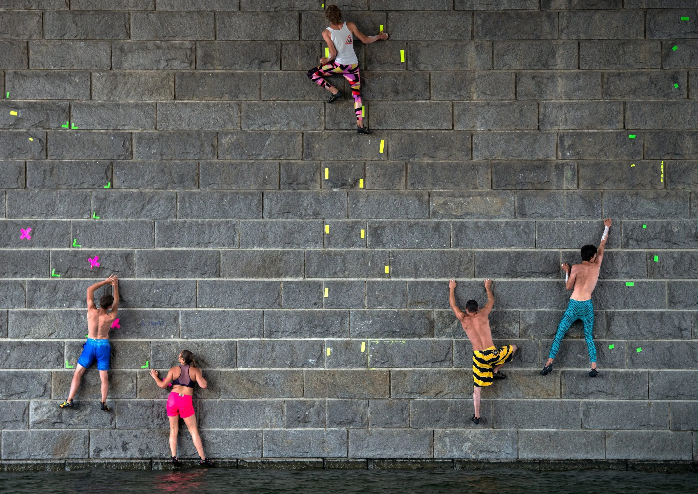 Participants climb up a prier of the Reichsbruecke over the Danube River during the “Urban Waters Cup 2016” boulder competition in Vienna, Austria, 06 August 2016. (Photo by Christian Bruna/EPA)