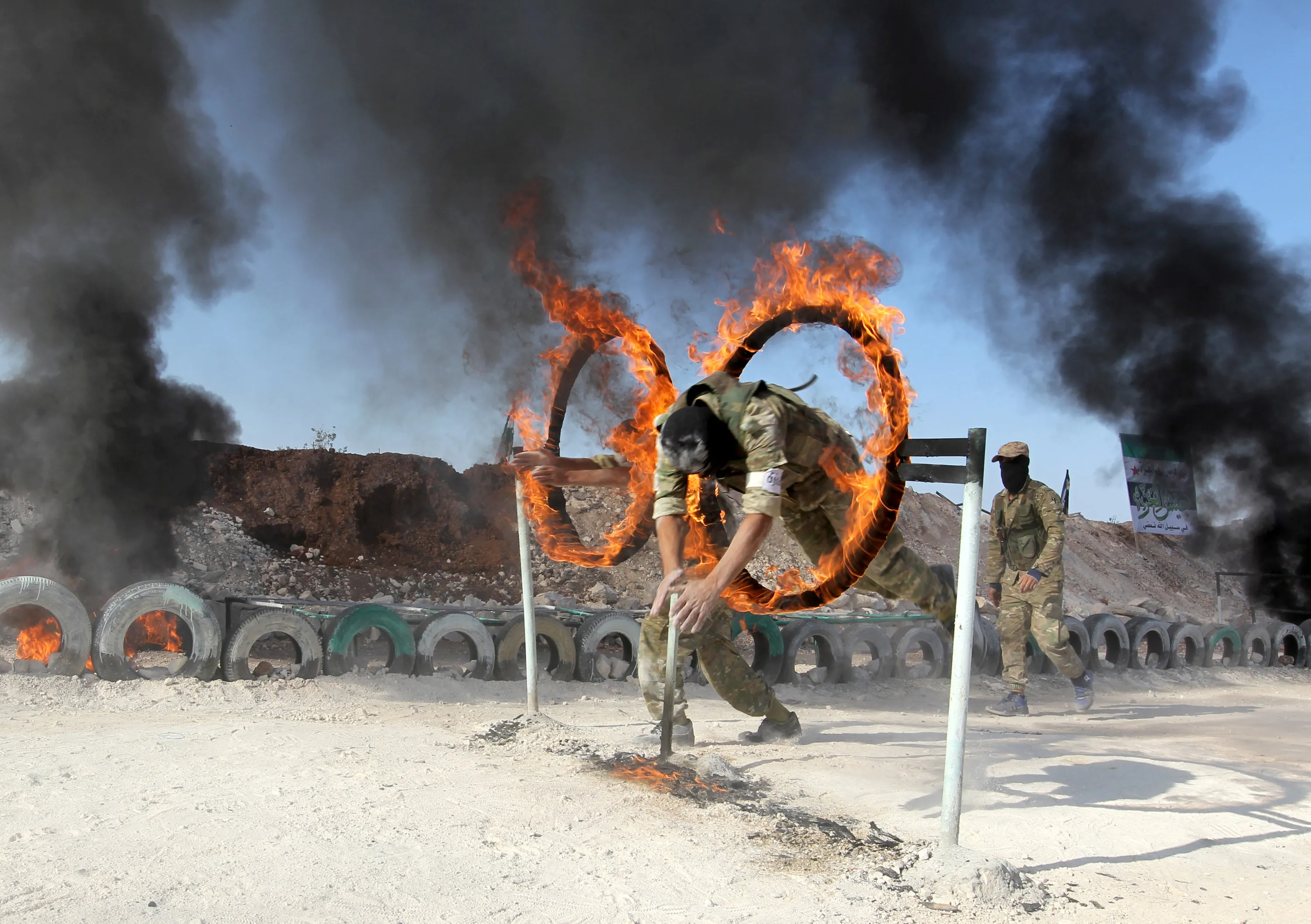 A fighter from Jaish al-Izzah, part of the Free Syrian Army, jumps through a fire loop as he demonstrates his skill during a military display as part of a graduation ceremony at a camp in the Hama province, Syria July 29, 2016. (Photo by Ammar Abdullah/Reuters)