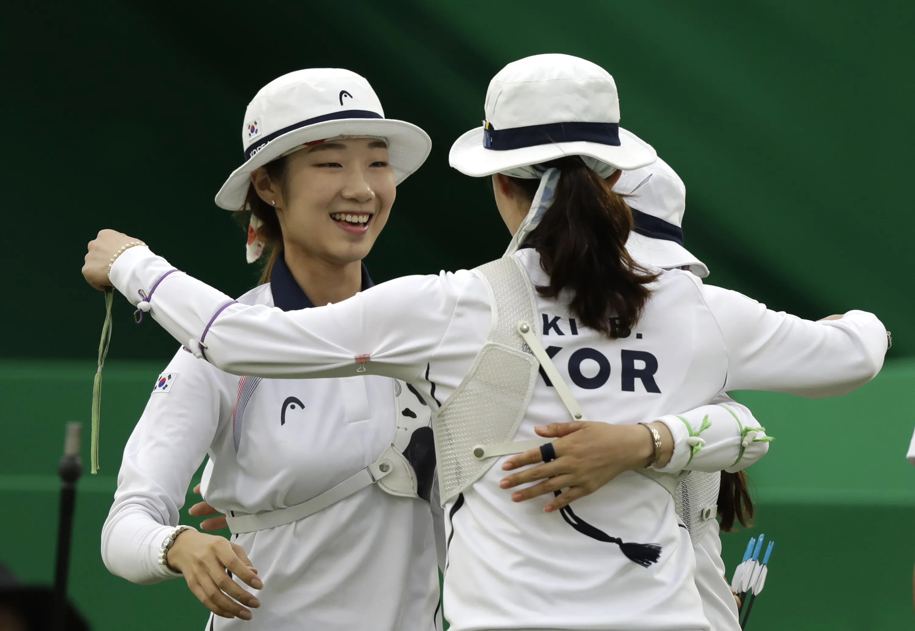 South Korea's Choi Mi-sun celebrates with her teammates during the women's team archery competition at the Sambadrome venue during the 2016 Summer Olympics in Rio de Janeiro, Brazil, Sunday, August 7, 2016. (Photo by Natacha Pisarenko/AP Photo)