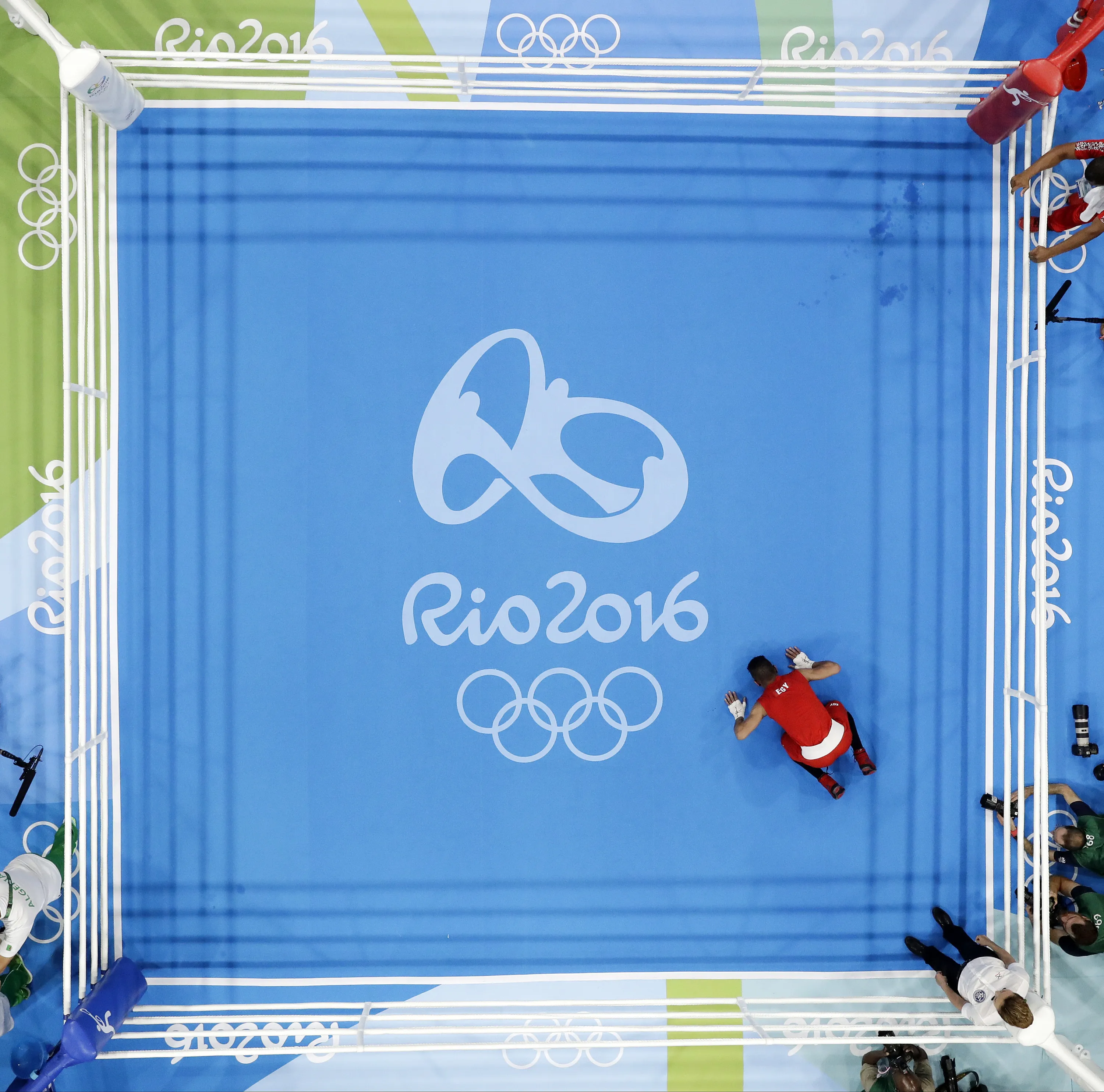 Egypt's Mahmoud Abdelaal kisses the matt after winning a match against Algeria's Reda Benbaziz during a men's lightweight 60-kg preliminary boxing match at the 2016 Summer Olympics in Rio de Janeiro, Brazil, Sunday, August 7, 2016. (Photo by Frank Franklin II/AP Photo)