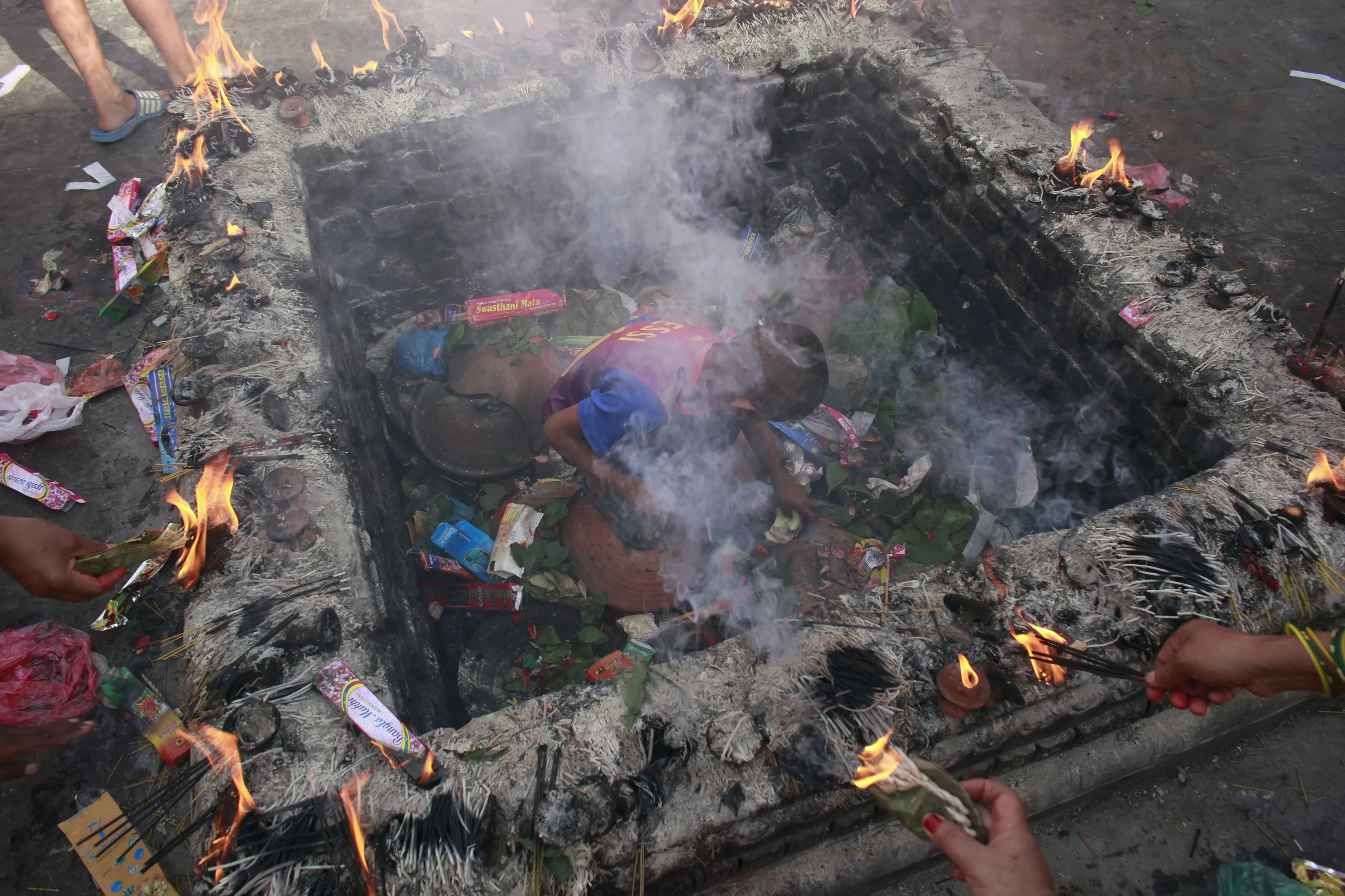 A Nepalese boy searches for coins offered by devotees during the Bol Bom pilgrimage at Pashupatinath temple in Kathmandu, Nepal, Monday, August 8, 2016. During this pilgrimage, devotees walk miles barefooted before offering water collected from Bagmati river, at the Pashupatinath temple in Katmandu. Shravan Somwar or Monday of Hindu calendar month of Shravan is considered auspicious for offering prayers to Lord Shiva, the god of destruction. (Photo by Niranjan Shrestha/AP Photo)