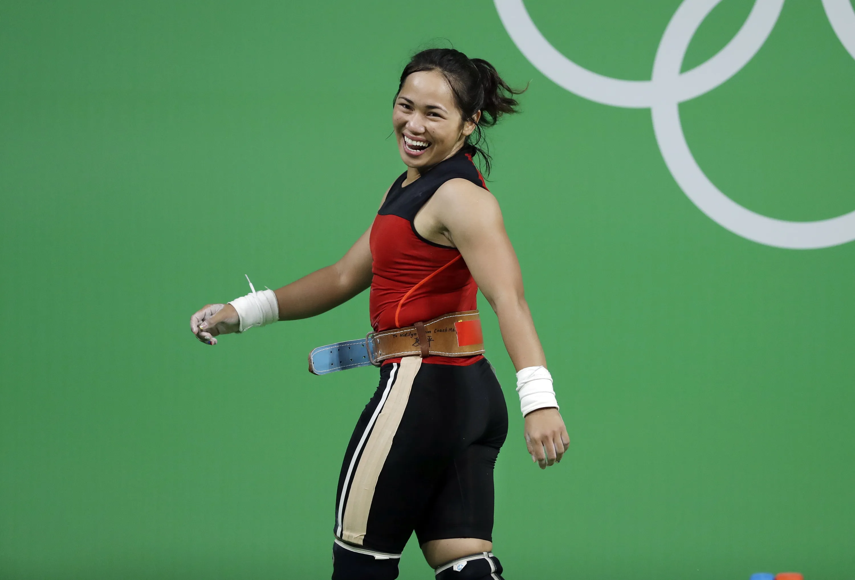 Hidilyn Diaz, of the Philipines, laughs as she leaves the stage after a lift in the women's 53kg weightlifting competition at the 2016 Summer Olympics in Rio de Janeiro, Brazil, Sunday, August 7, 2016. (Photo by Mike Groll/AP Photo)