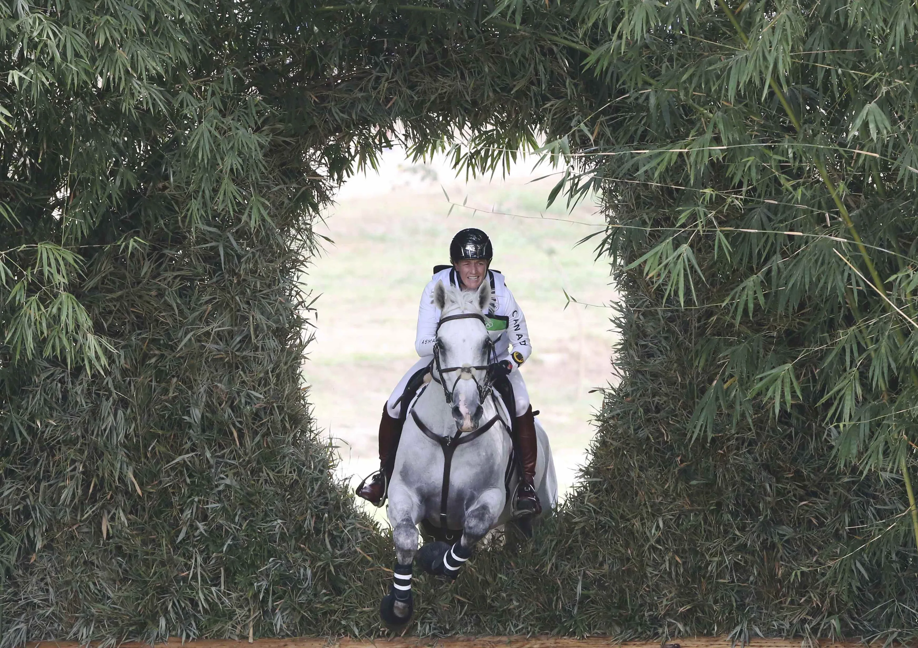 2016 Rio Olympics, Equestrian, Preliminary, Eventing Individual Cross Country, Deodoro Olympic Equestrian Centre, Rio de Janeiro, Brazil on August 8, 2016. Colleen Loach (CAN) of Canada riding Qorry Blue D'argouges jumps through the bamboo keyhole. (Photo by Adrees Latif/Reuters)