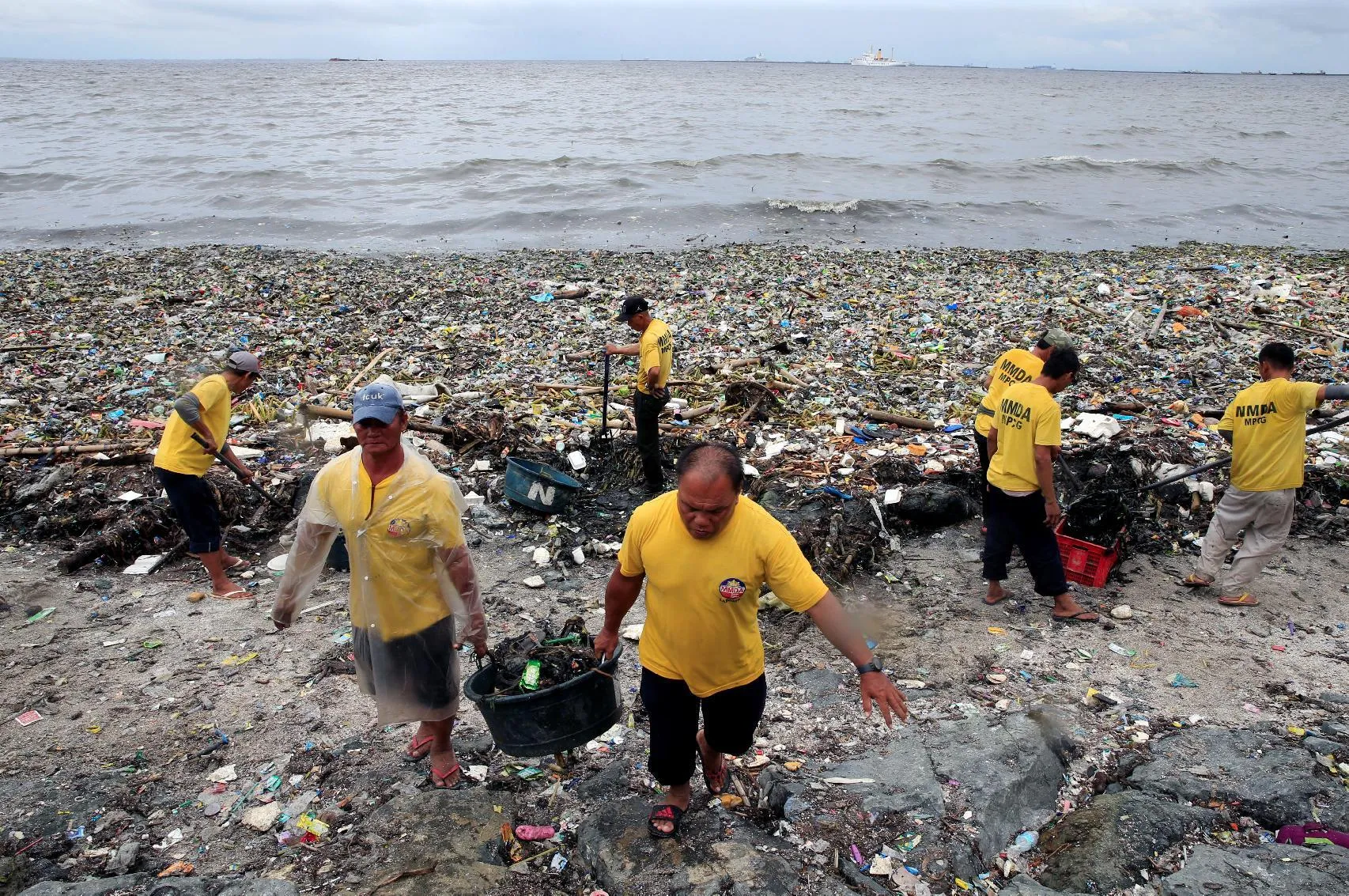 Government workers scoop out rubbish washed ashore due to strong waves brought about by the monsoon rains during a clean up operation along Manila bay, metro Manila, Philippines, August 8, 2016. (Photo by Romeo Ranoco/Reuters)