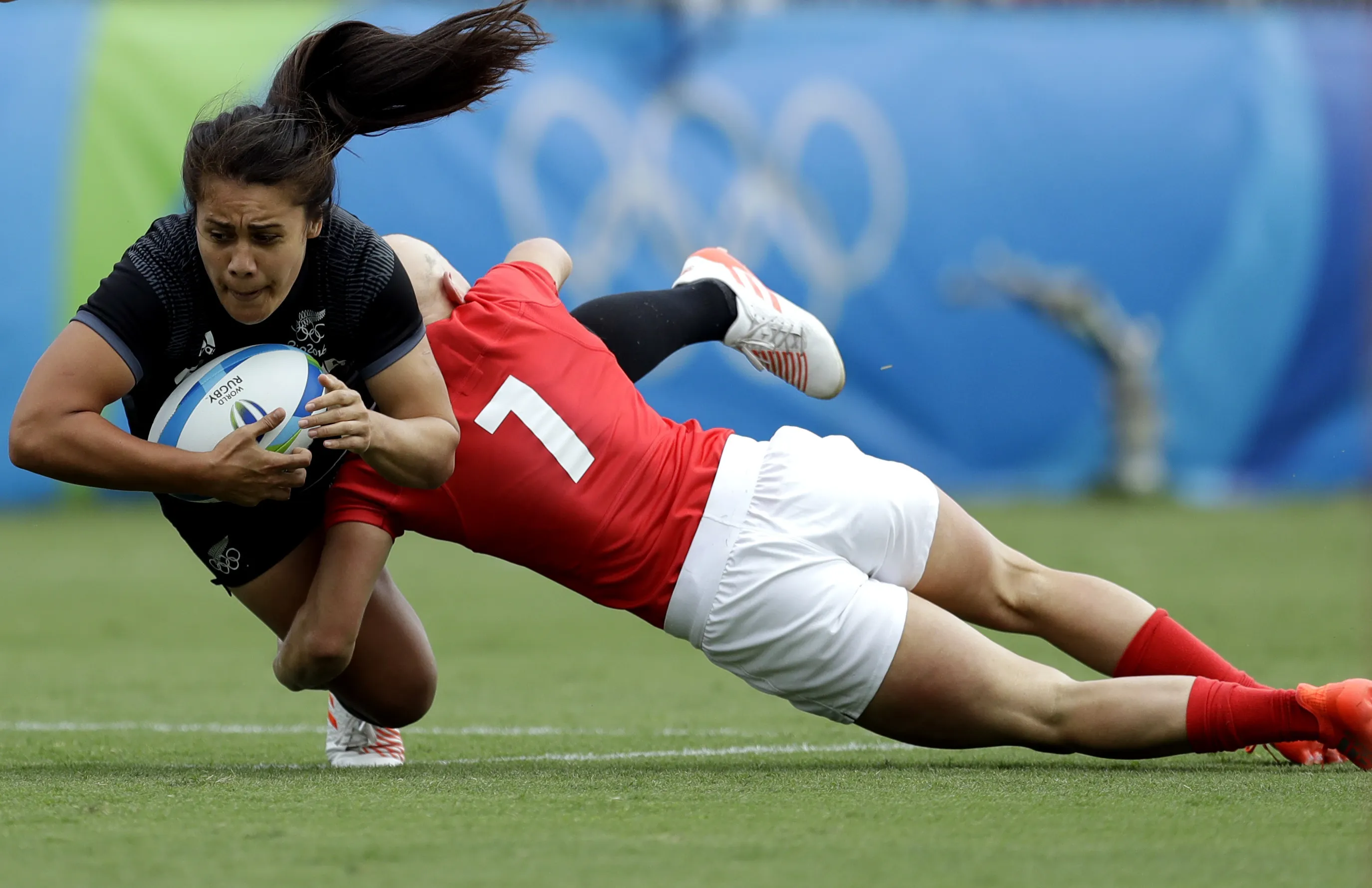 New Zealand's Shakira Baker, left, is tackled by Great Britain's Heather Fisher, during the women's rugby sevens semi final match at the Summer Olympics in Rio de Janeiro, Brazil, Monday, August 8, 2016. (Photo by Themba Hadebe/AP Photo)