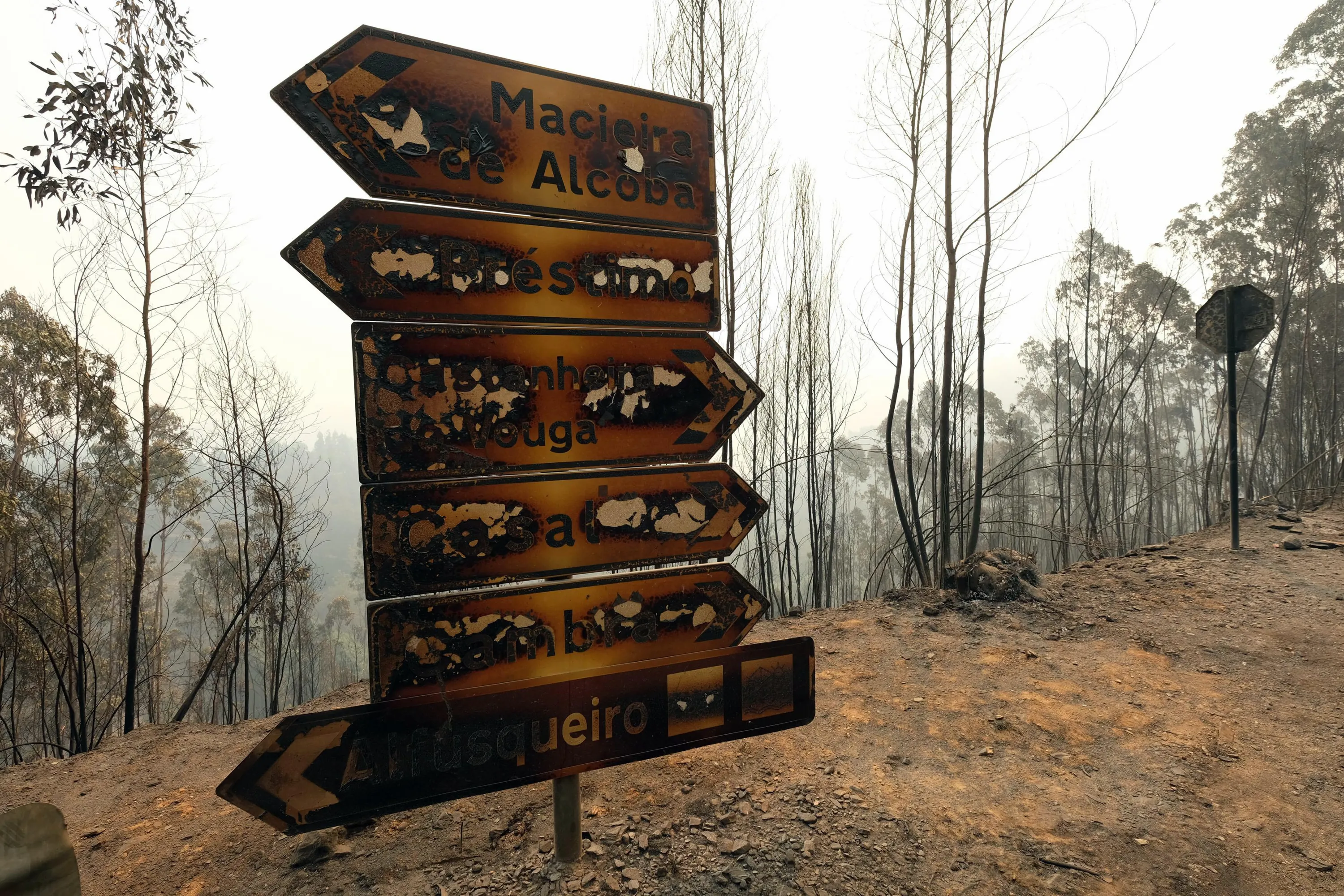Burnt traffic signs stand by a road, Tuesday, August 9 2016, near Agueda, in the region of Aveiro, northern Portugal, where a fire raged Monday. The National Civil Protection Service said some 2,900 firefighters were in action Tuesday fighting dozens of forest fires. The worst-hit areas were in northern Portugal, where temperatures have exceeded 30 degrees Celsius (86 Fahrenheit) since Saturday. (Photo by Sergio Azenha/AP Photo)
