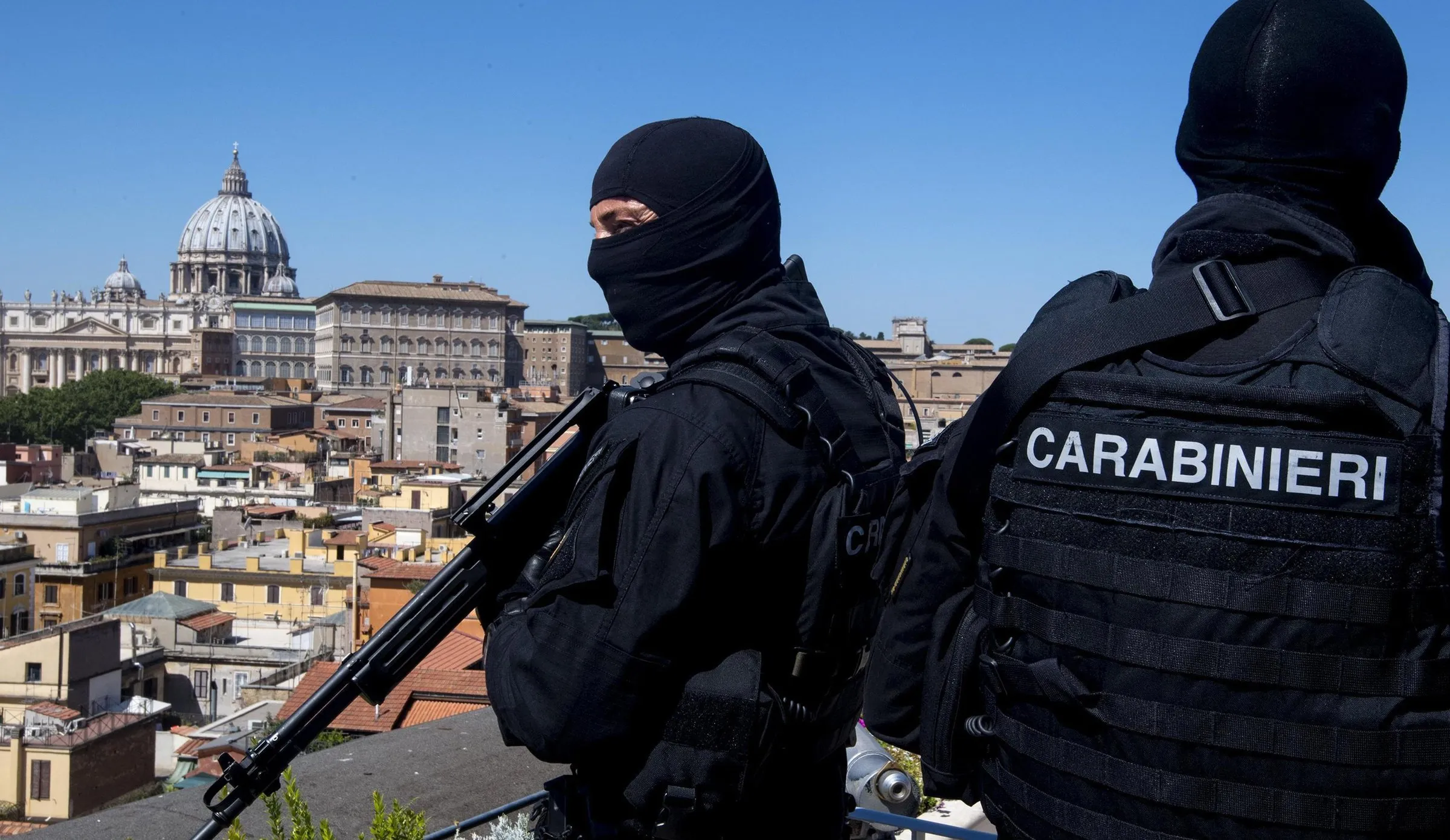Carabinieri (Italian paramilitary police) special unit's officers patrol the area next to St. Peter's Basilica, background left, in Rome, Tuesday, August 9, 2016. Anti-terrorism measures have been tightened in Rome. They include the stationing of police cars and van at the end of a boulevard that runs past the Colosseum, and police patrols and surveillance along Via del Corso, a long street lined with clothing shops and which also runs by the premier's office. (Photo by Claudio Peri/ANSA via AP Photo)