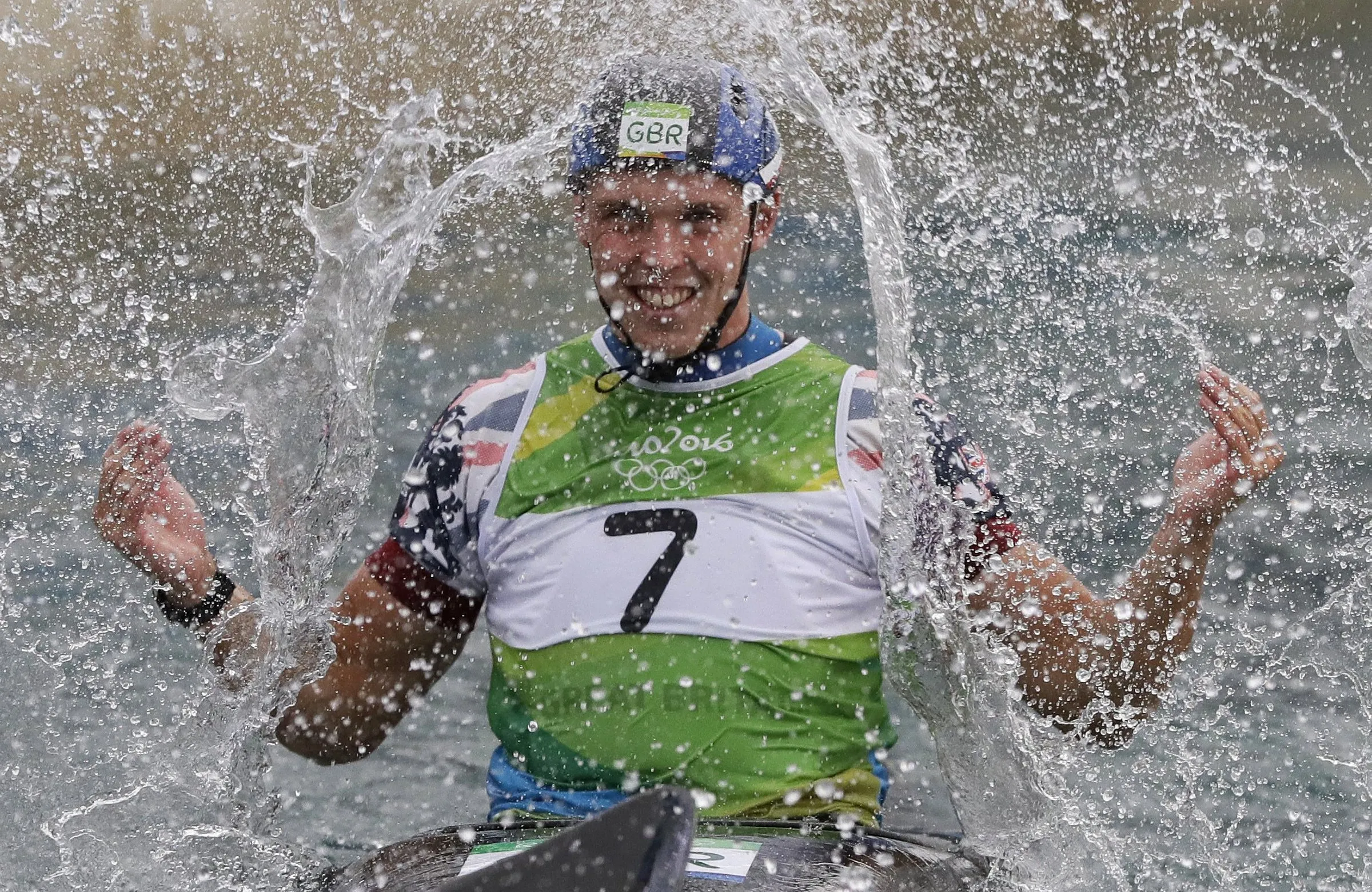 Joseph Clarke, of Britain, celebrates winning the gold medal in the kayak K1 men's final of the canoe slalom at the 2016 Summer Olympics in Rio de Janeiro, Brazil, Wednesday, August 10, 2016. (Photo by Kirsty Wigglesworth/AP Photo)