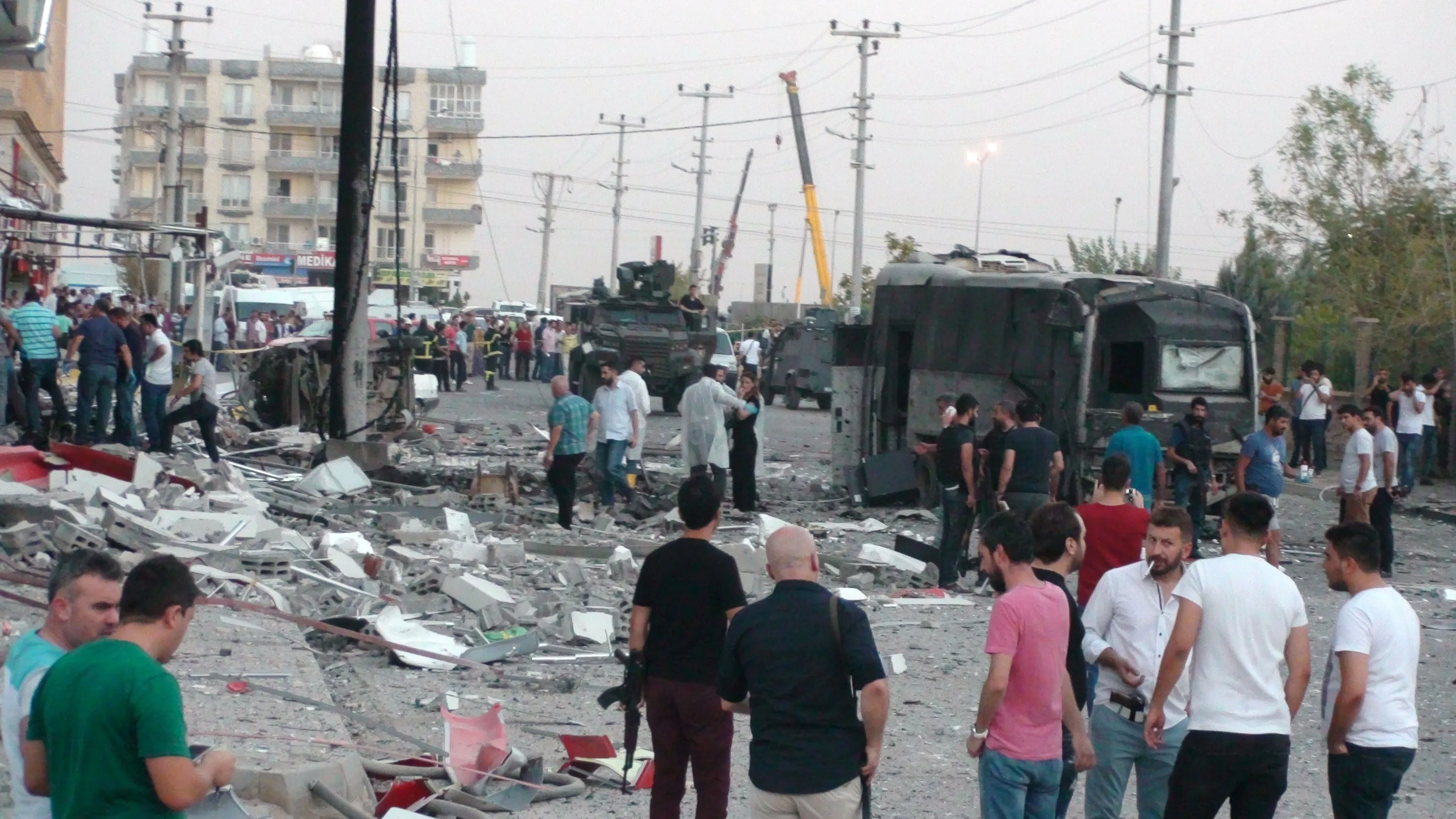 Police search an area after a bomb attack in Mardin, Turkey, Wednesday, August 10, 2016. A wave of Kurdish rebel attacks targeting police and soldiers in Turkey's mainly-Kurdish southeast killed at least 12 people on Wednesday, as Turkey was still dealing with the aftermath of a military coup attempt. (Photo by Neriman Celebi/ IHA via AP Photo)