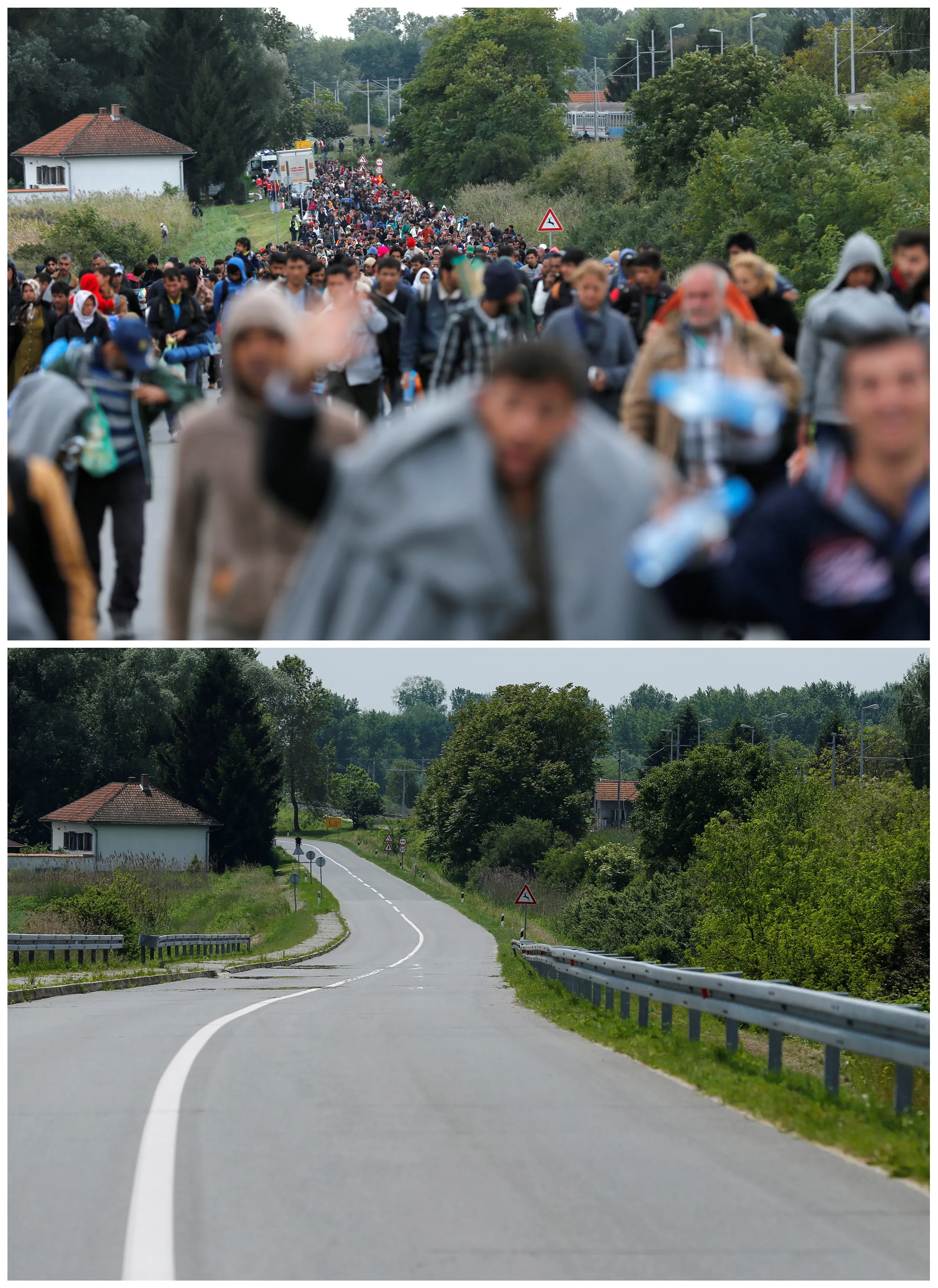 A combination picture shows migrants walking towards the Hungarian border after arriving at the train station in Botovo, Croatia September 24, 2015 (top) and the same location May 26, 2016. (Photo by Antonio Bronic/Reuters)