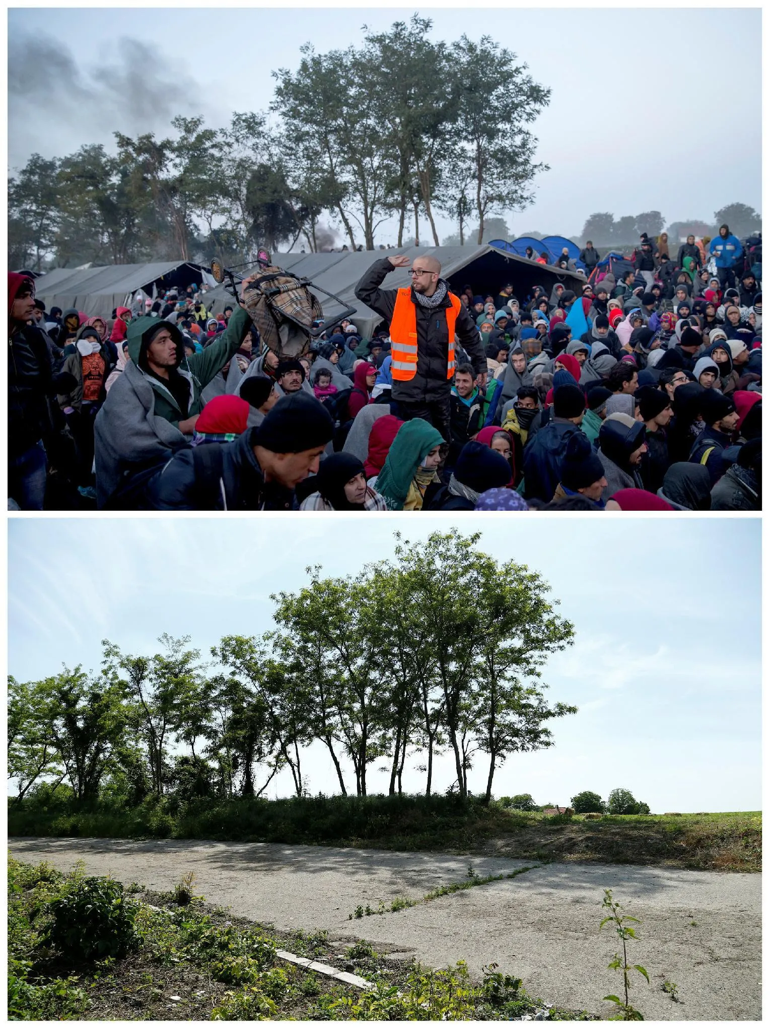 A combination picture shows a humanitarian volunteer trying to help migrants as they are waiting to cross the border with Croatia near the village of Berkasovo, Serbia October 23, 2015 (top) and the same location May 27, 2016. (Photo by Marko Djurica (top)/Antonio Bronic/Reuters)