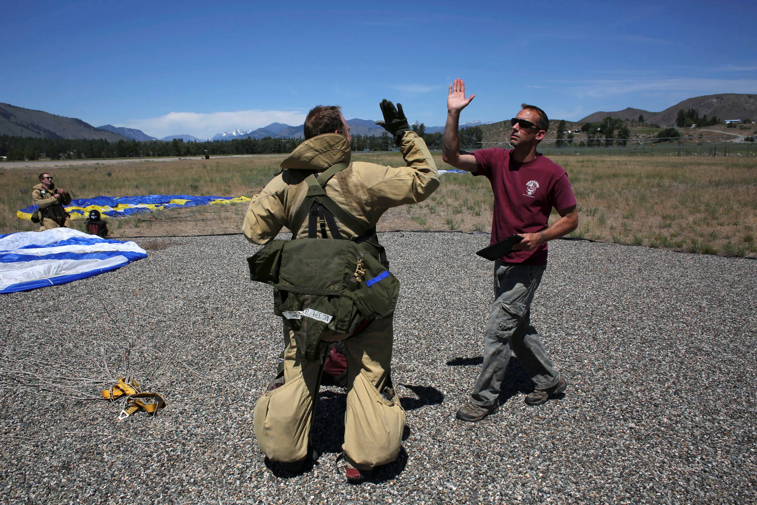Smokejumpers celebrate a successful training jump at the North Cascades Smokejumper Base in Winthrop, Washington, U.S., June 6, 2016. (Photo by David Ryder/Reuters)