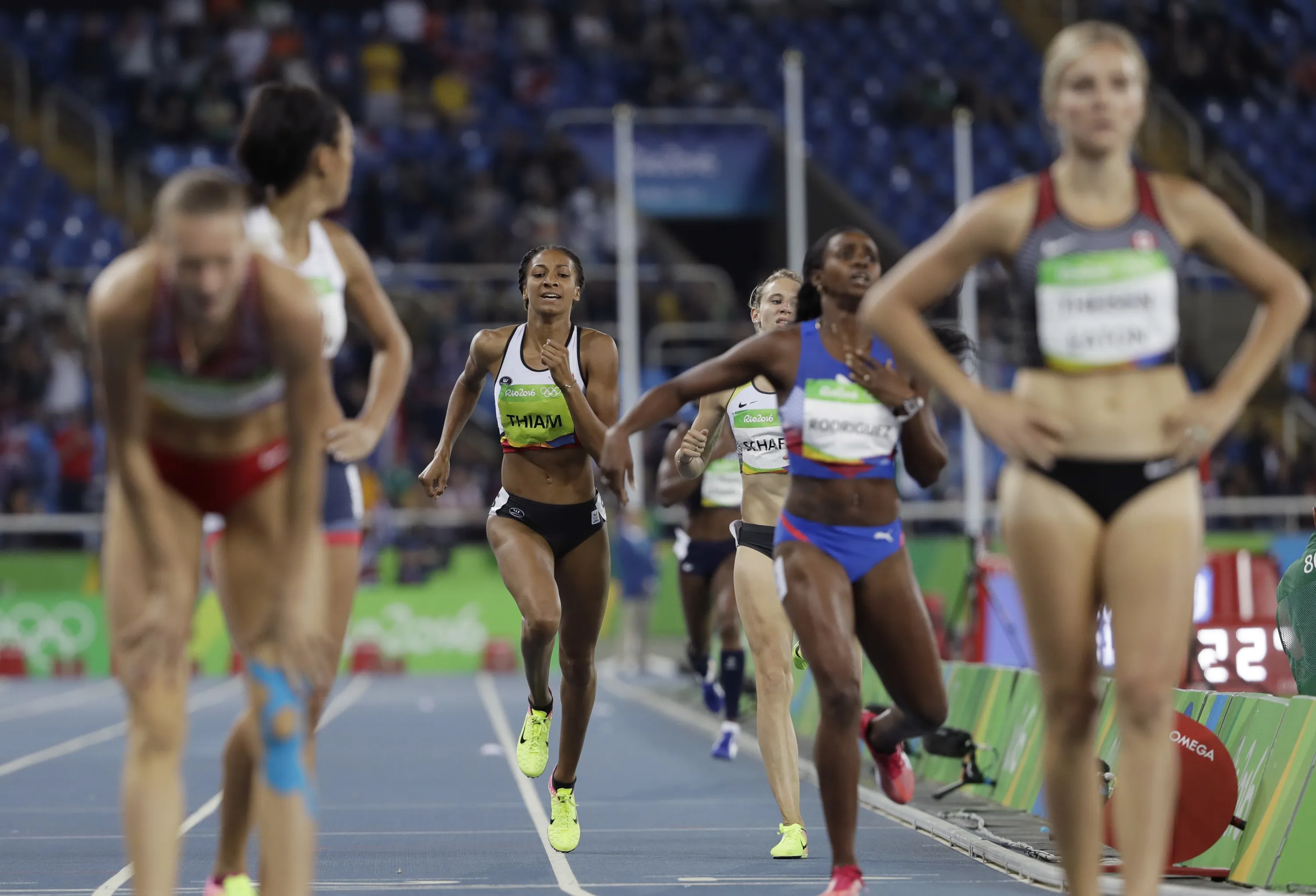 Belgium's Nafissatou Thiam, center, competes in the women's heptathlon 800-meter heat during the athletics competitions of the 2016 Summer Olympics at the Olympic stadium in Rio de Janeiro, Brazil, Saturday, August 13, 2016. (Photo by David J. Phillip/AP Photo)