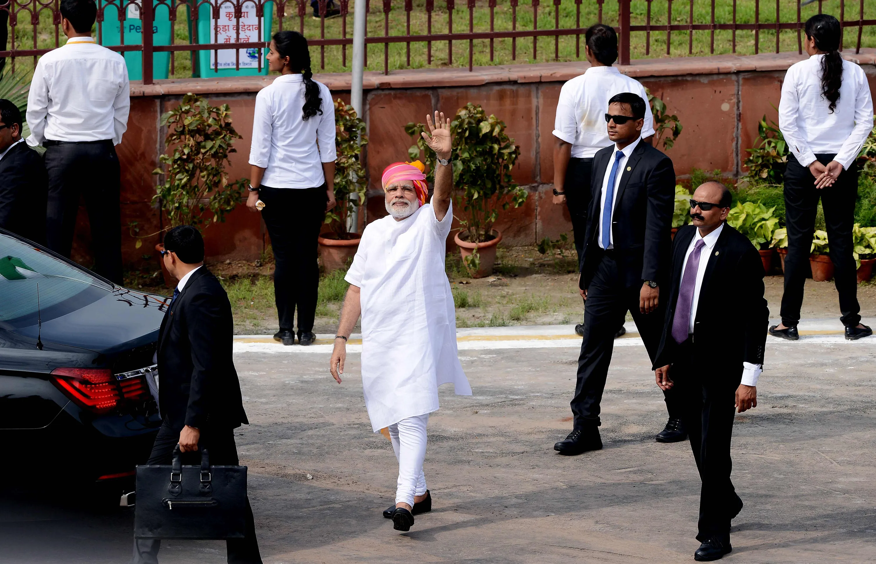 Indian Prime Minister Narendra Modi (C) waves to spectators before leaving The Red Fort, during the 70th Independence Day celebrations, in New Delhi on August 15, 2016. (Photo by Money Sharma/AFP Photo)