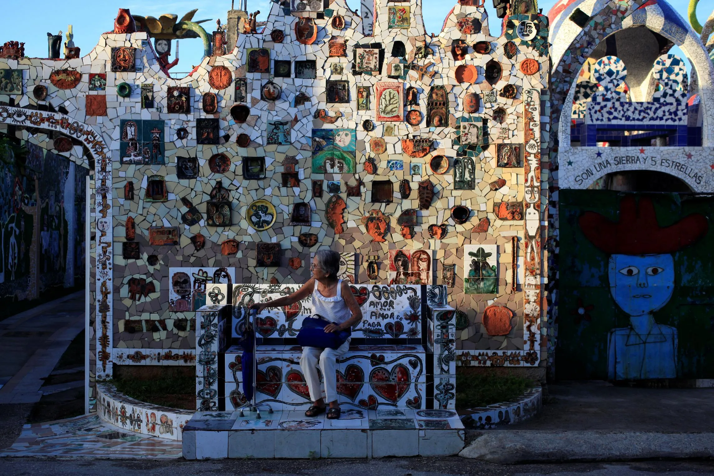 An old woman sits near a wall decorated with mosaics of Cuban artist Jose Fuster in the seaside village of Jaimanitas in Havana, Cuba, July 14, 2016. Fuster has also adorned the facades of houses in the neighborhood with Picasso-like paintings and playful ceramic figures, transforming the humble neighborhood into an island of brightness. (Photo by Enrique de la Osa/Reuters)