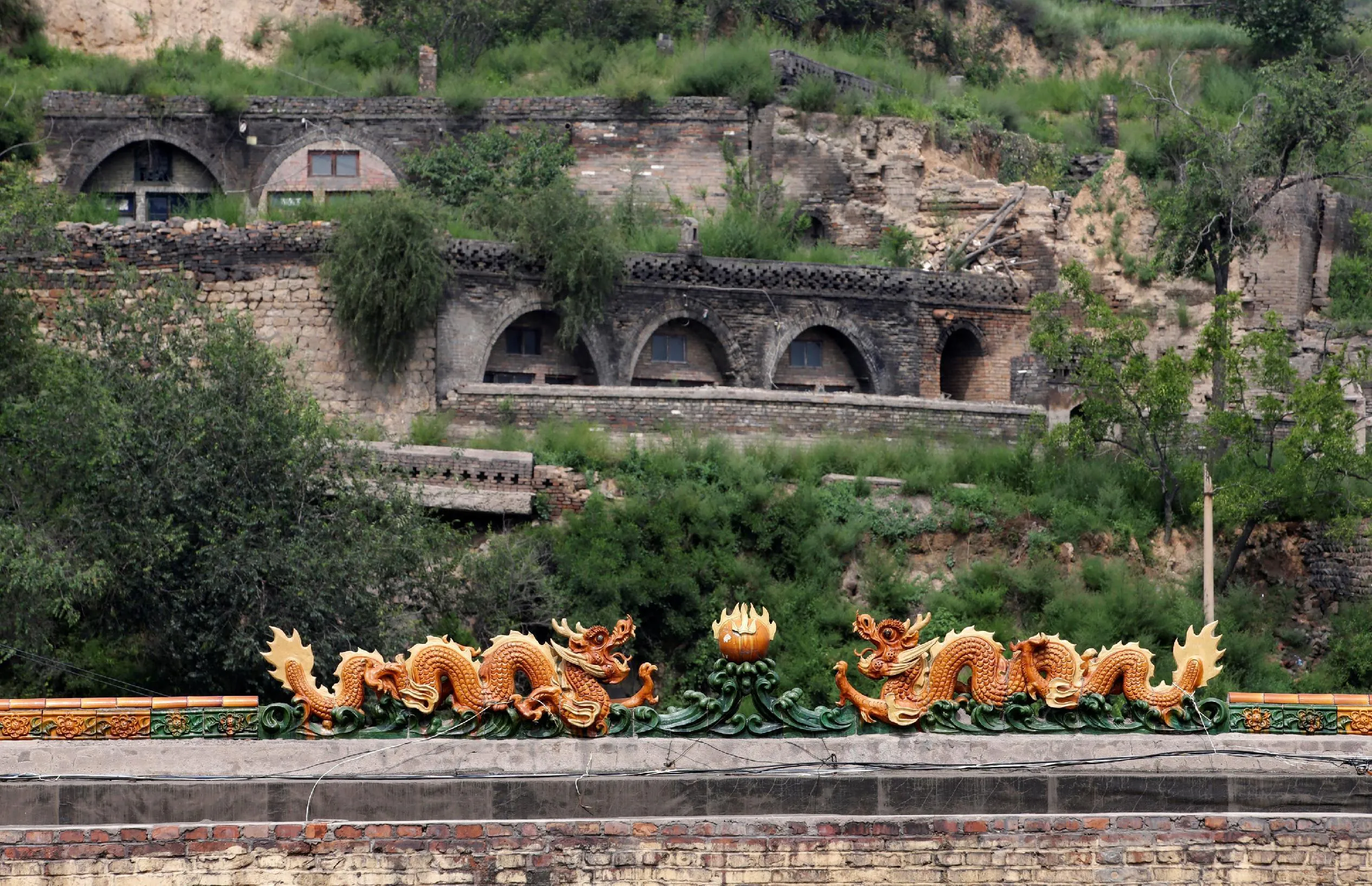 A dragon rooftop decoration is seen in an area where land is sinking next to a coal mine in the abandoned Duxigou village of Xiaoyi, China's Shanxi province, August 2, 2016. (Photo by Jason Lee/Reuters)