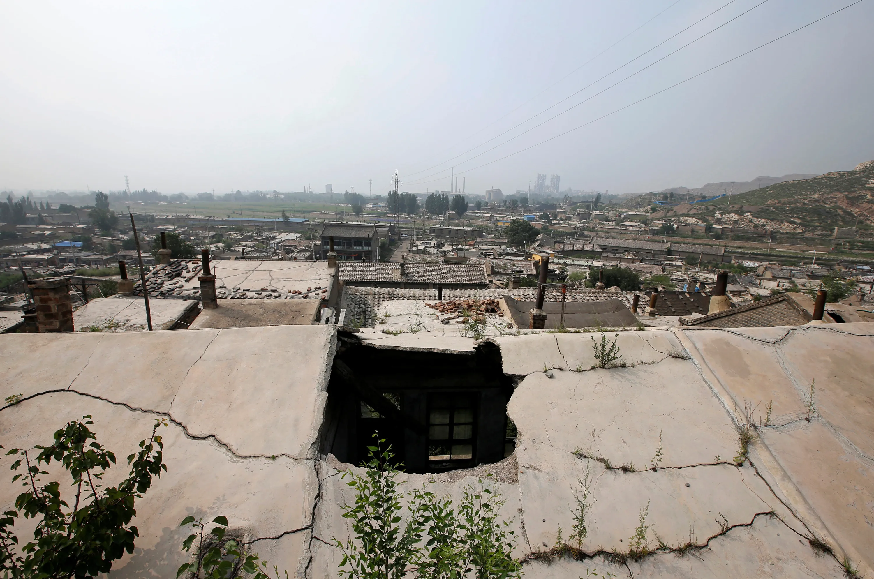 A hole and cracks are seen on the roof of an abandoned house in an area where land is sinking near a coal mine in Kouquan township of Datong, China's Shanxi province, August 1, 2016. (Photo by Jason Lee/Reuters)