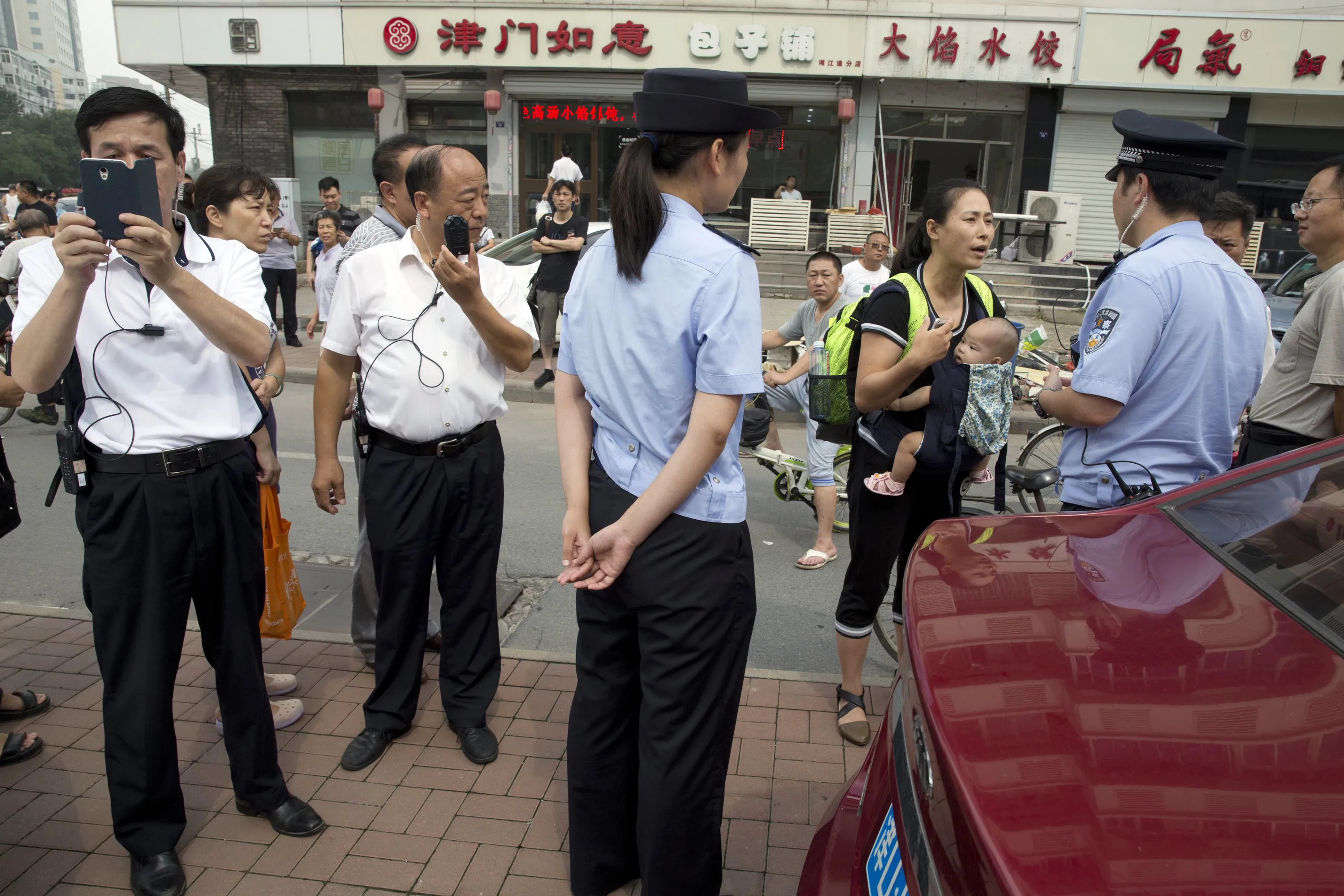 Yuan Shanshan, third right, the wife of detained Chinese lawyer Xie Yanyi, carries her child as she talks to a police officer while other plain clothes security personnel film journalists near the Tianjin No. 2 Intermediate People's Court in northern China's Tianjin Municipality on Tuesday, August 2, 2016. The court in the northern Chinese city of Tianjin has begun to try the first of four human rights advocates charged with subversion of state power, marking the first publicly acknowledged hearing in a yearlong case shrouded in secrecy and involving hundreds of Chinese human rights activists. (Photo by Ng Han Guan/AP Photo)