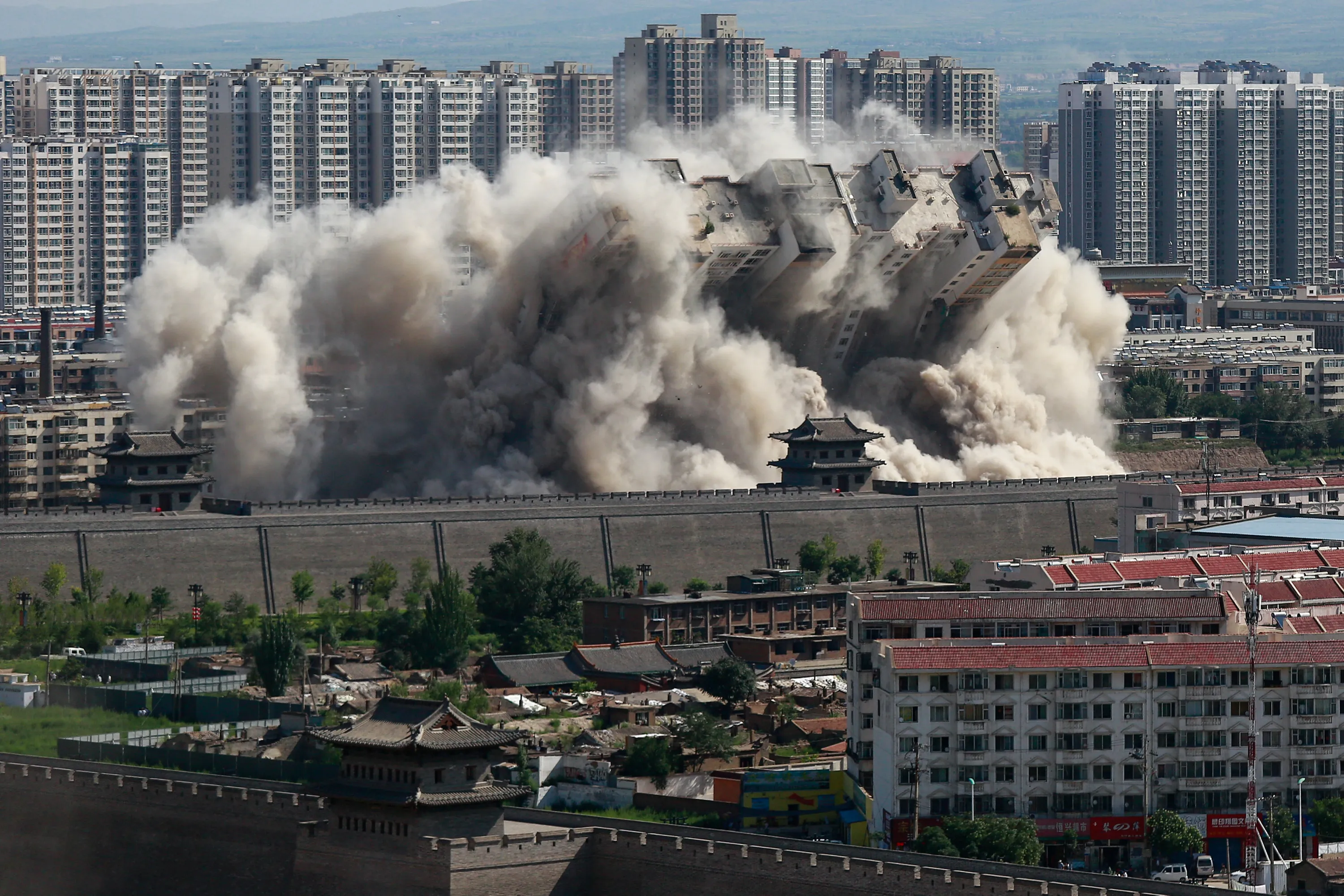 A building crumbles during a controlled demolition conducted to better protect the nearby ancient area of the city in Datong, Shanxi province, China, August 8, 2016. (Photo by Reuters/China Daily)