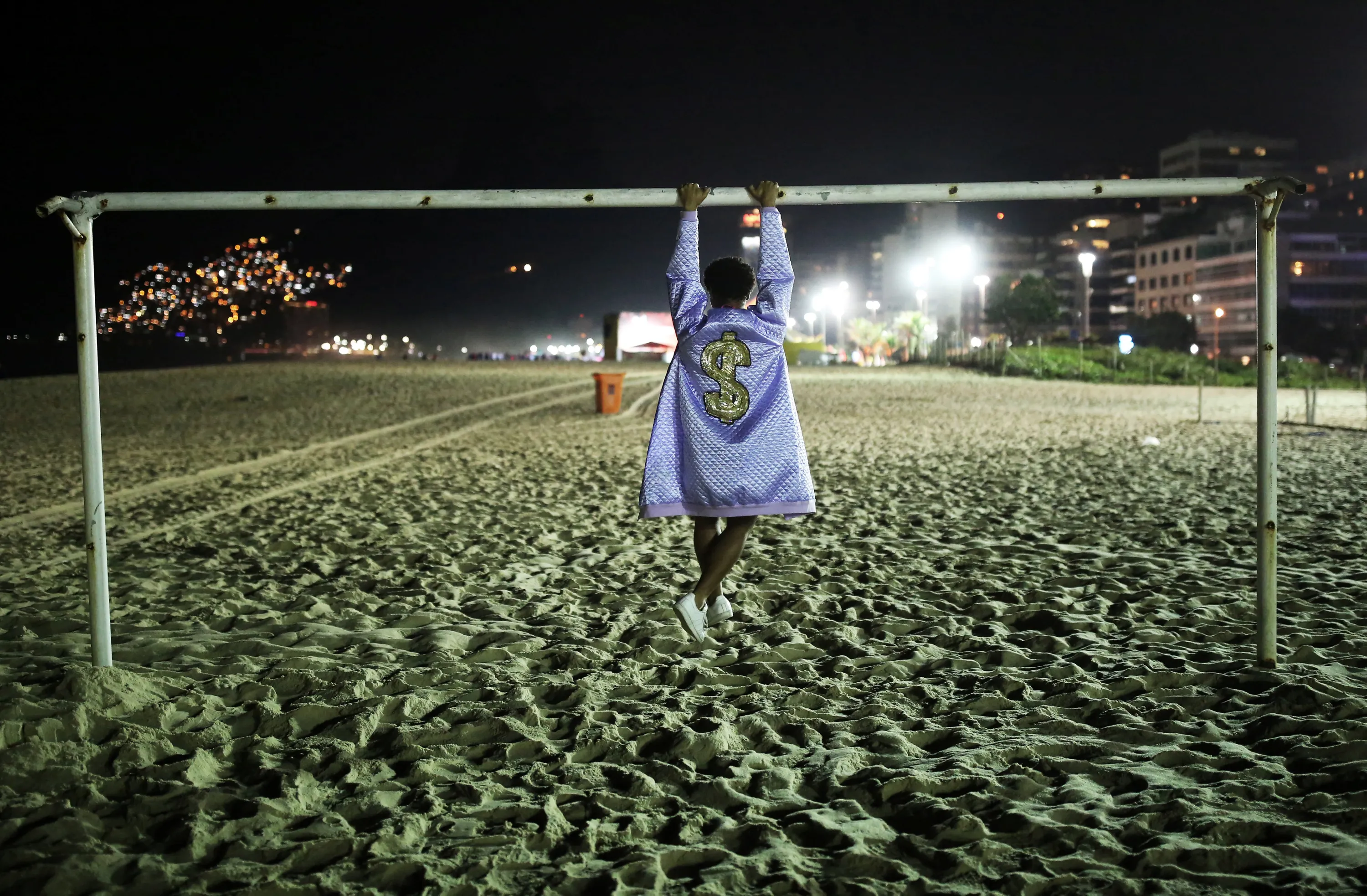 Breno, 27, poses on a goal before a mermaid competition at Ipanema beach in Rio de Janeiro, Brazil on August 14, 2016. (Photo by Nacho Doce/Reuters)