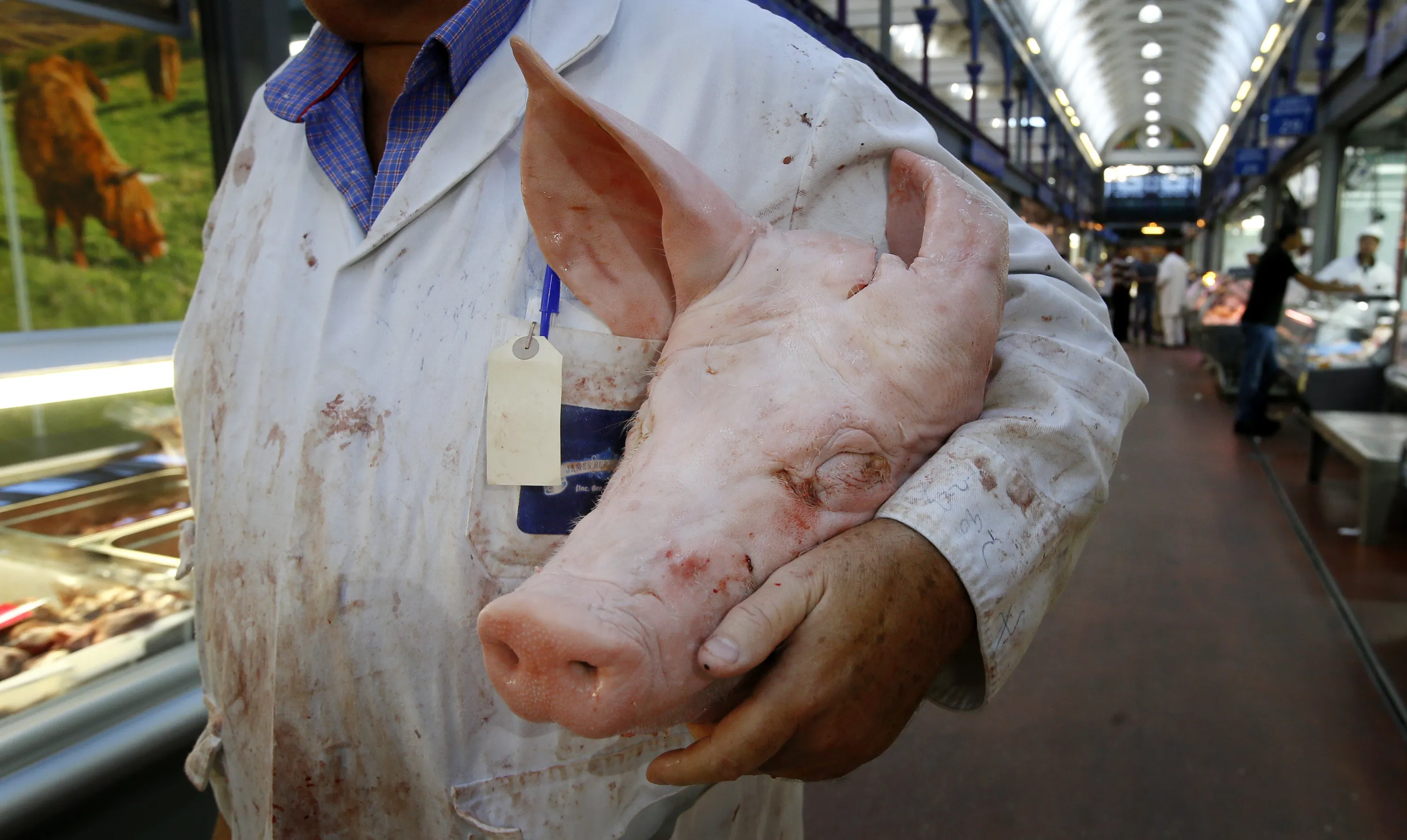 In this photo taken on Monday, July 18, 2016, a butcher carries a pigs head at Smithfield Market in London. Welsh farmers like Rees Roberts, who have 1,000 acres with sheep, cattle and crops, can expect to earn a premium on their meats thanks to a certificate of regional authenticity. But that marker of distinction – the same kind that ensures Champagne can only come from the French region of the same name – is granted by the European Union and is now at risk after Britain voted to leave the 28-country bloc. (Photo by Kirsty Wigglesworth/AP Photo)